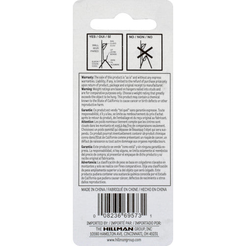 Securely hang framed art and décor with Hillman’s Conventional Picture Hangers. The classic hook-and-nail design installs easily and supports up to 50 lb per hanger, ideal for drywall, wood, and plaster surfaces.