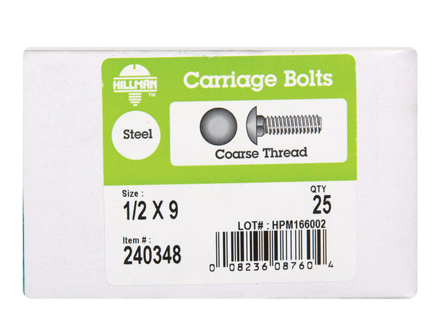 Hillman 1/2 in. x 9 in. Zinc-Plated Steel Carriage Bolts, Coarse Thread (25-Pack)