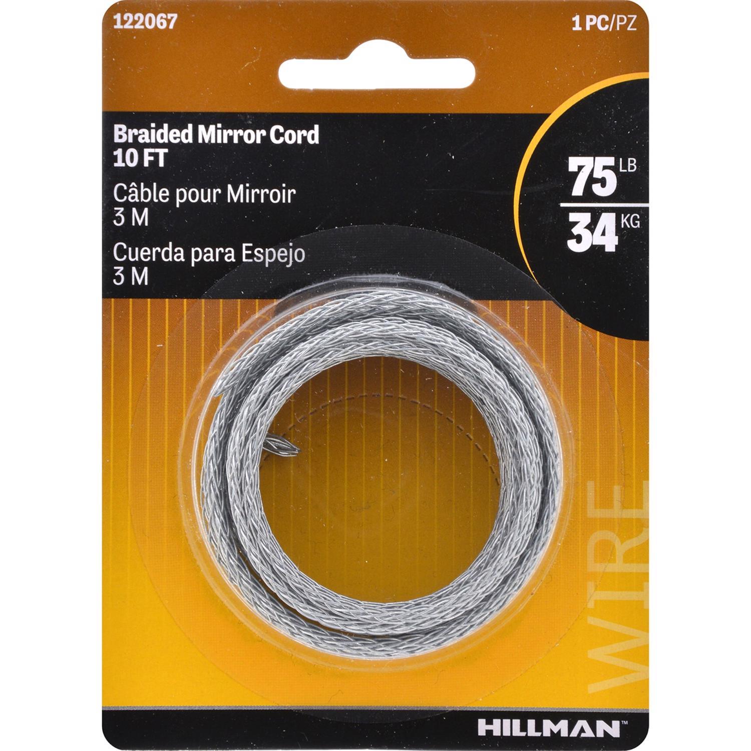 Durable Hillman braided mirror/picture hanging cord supports frames and mirrors up to 75 lb. Galvanized silver finish resists rust and corrosion for reliable, long-lasting hanging around the home or gallery.