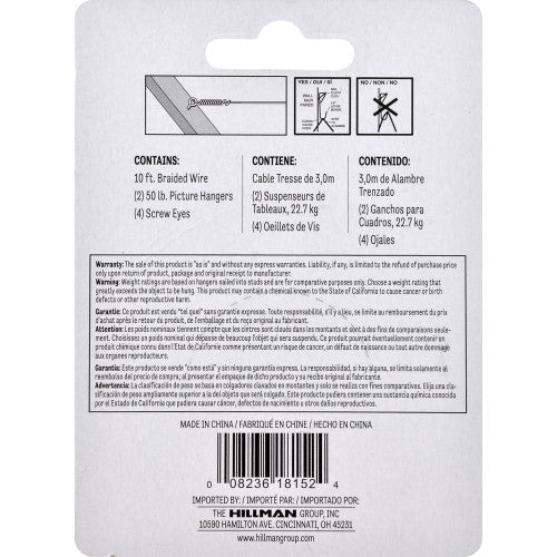 | Included Components | 10 ft braided wire; (2) 50 lb picture hangers; (4) screw eyes |