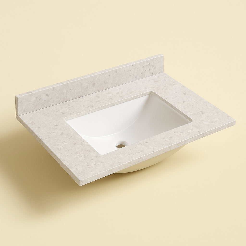 The Home Decorators Collection 31-inch River Stone Vanity Top combines durability and elegance with its engineered stone composite and integrated white sink. Perfect for enhancing any bathroom space.