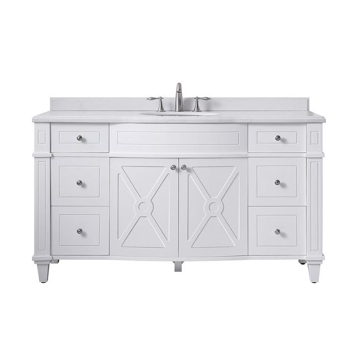 To find treasure, know that X marks the spot. Discover the alluring Bergeron 60 in. vanity by Home Decorators Collection. With its strikingly cross-braced cabinet doors and chic pure white lacquered finish, the Bergeron is a classic choice for any bathroom. White Yves cultured marble graces its bullnose edged countertop with matching backsplash and undermount ceramic sink. A central bowfront cabinet plus 6 flanking drawers, all graced with brushed nickel hardware, adds valuable storage.