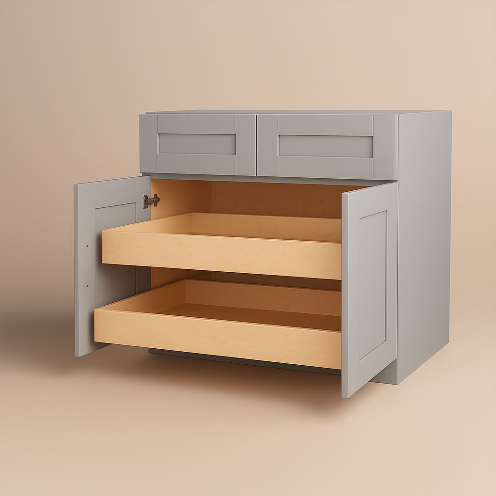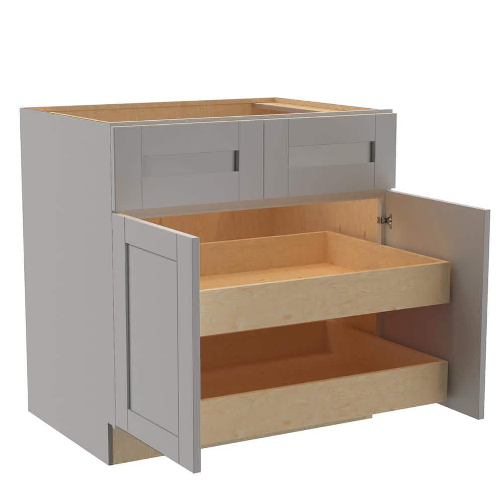 The Washington Veiled Gray Shaker Kitchen Cabinet combines durable plywood construction with elegant shaker-style design. Featuring soft-close drawers and adjustable shelving, it offers both functionality and timeless style for your kitchen.