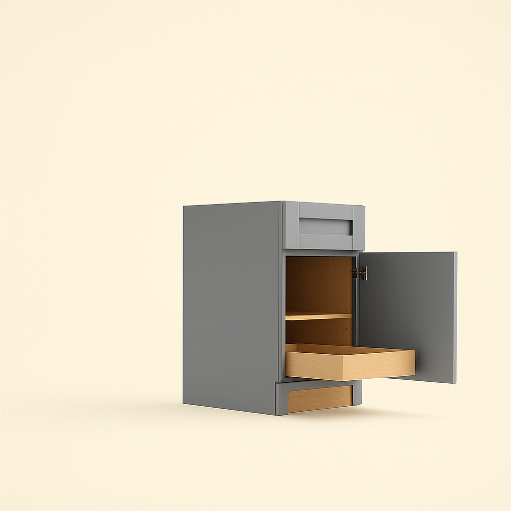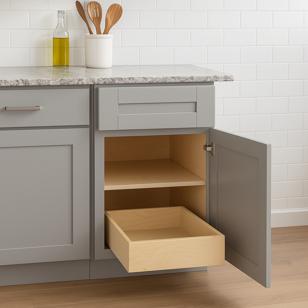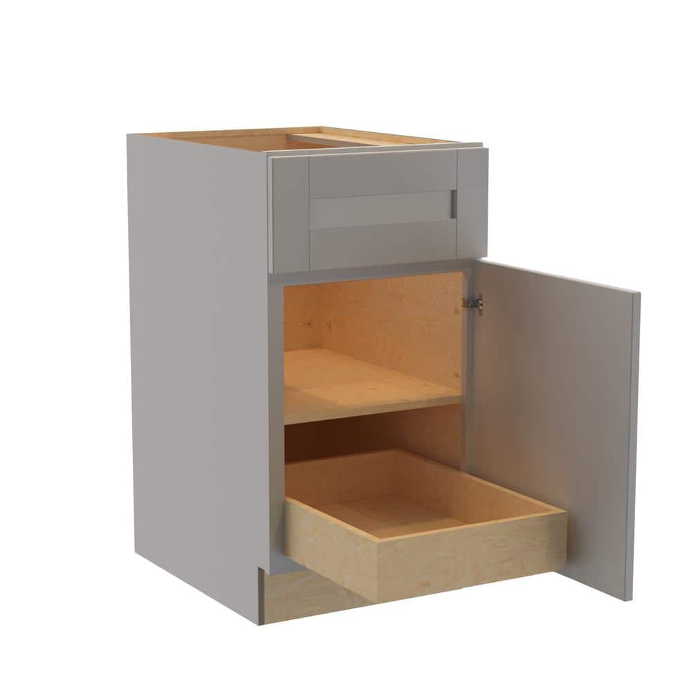 The Washington Veiled Gray Shaker Base Kitchen Cabinet combines timeless design with modern functionality. Crafted from CARB II compliant plywood and featuring a durable thermofoil finish, it offers moisture resistance and longevity. Soft-close doors and drawers add a touch of luxury to your kitchen.