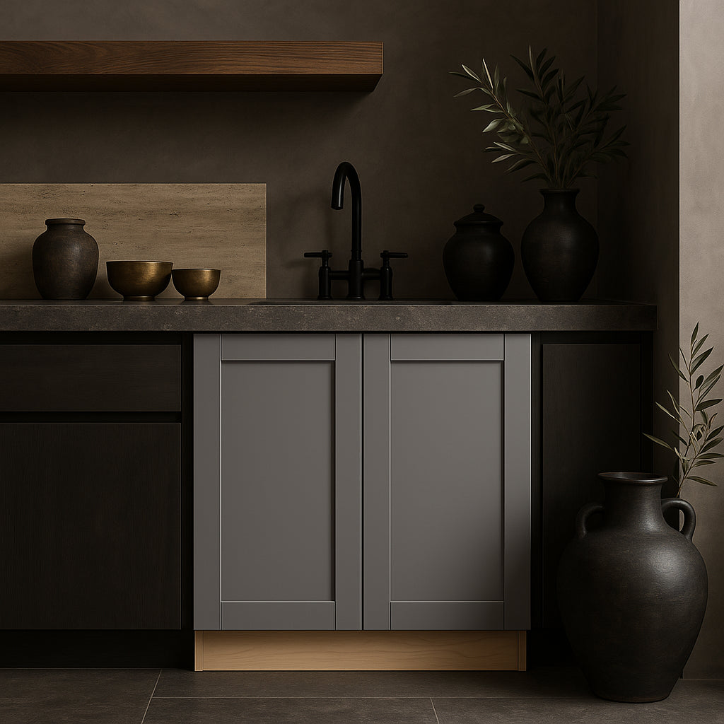 - Modern Design: Shaker-style doors with a veiled gray finish for a contemporary kitchen aesthetic.