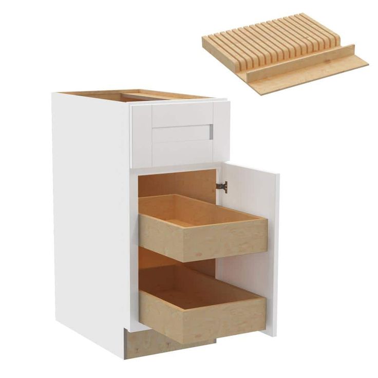 The Vesper White Plywood Shaker Base Kitchen Cabinet by Home Decorators Collection combines contemporary style with solid construction. Crafted with a durable white vinyl finish and framed MDF shaker doors, it offers soft-close features and ample storage with two rollout trays and a spice tray insert.
