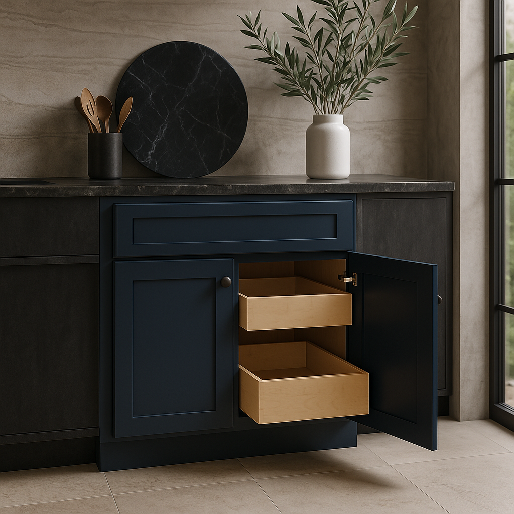The Washington Vessel Blue Shaker Base Kitchen Cabinet combines modern elegance with practical functionality. Featuring a deep blue vinyl finish, soft-close doors, and durable plywood construction, this cabinet is perfect for stylish and efficient kitchen storage.