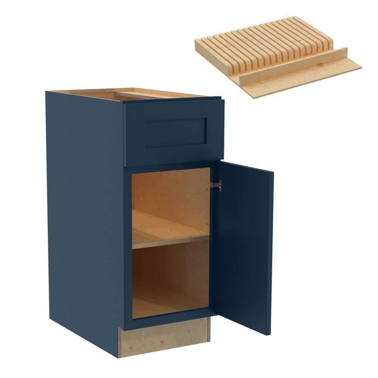 Elevate your kitchen with the Newport Assembled Plywood Base Cabinet in Mythic Blue by Home Decorators Collection. Constructed with all-plywood and finished in a rich Mythic Blue, this cabinet offers durability and stunning aesthetic appeal. Shaker-style doors and a built-in knife block provide both function and style.