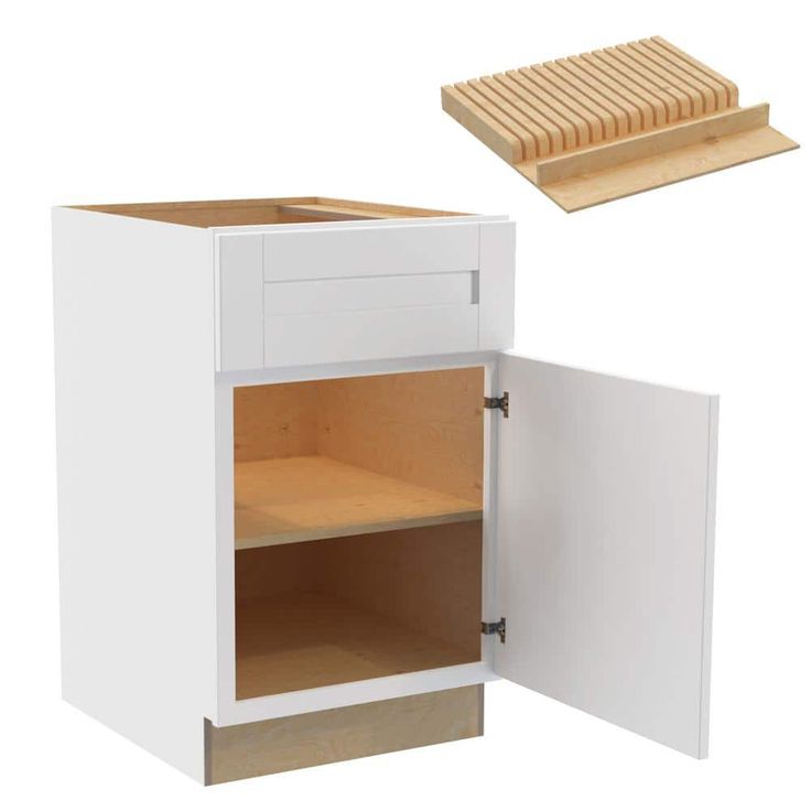 The Home Decorators Collection's Washington Vesper White Base Kitchen Cabinet combines elegance with practicality, featuring a sleek Shaker design and durable plywood construction. With a built-in right-hand knife block, this cabinet enhances organization while maintaining a sophisticated aesthetic.