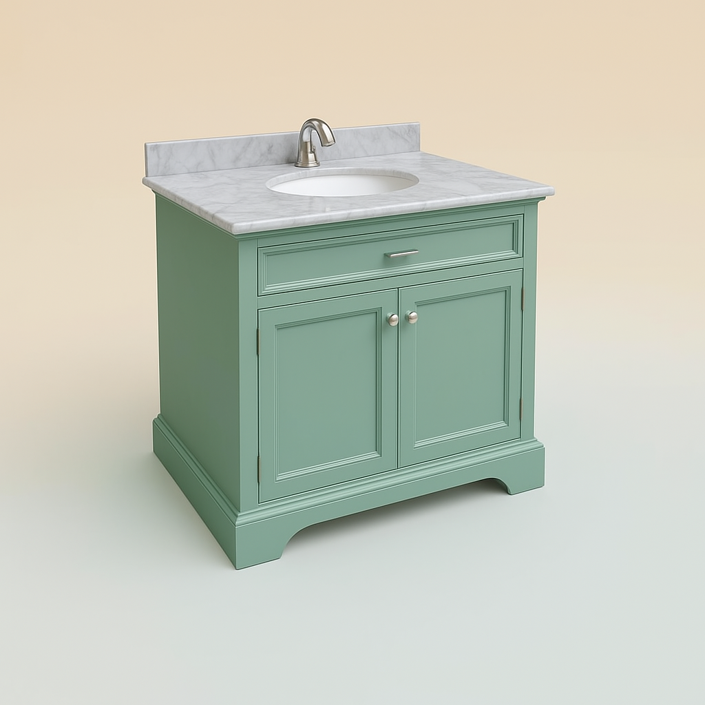 Elevate your bathroom's aesthetic with this exquisite vanity, blending timeless design with modern functionality. The sea green finish and brushed nickel hardware create a harmonious balance of color and texture, while the Carrara marble top adds a touch of luxury. Style it with a matching mirror and soft lighting to complete the look. This piece is not just a vanity; it's a statement of refined taste and practical elegance.