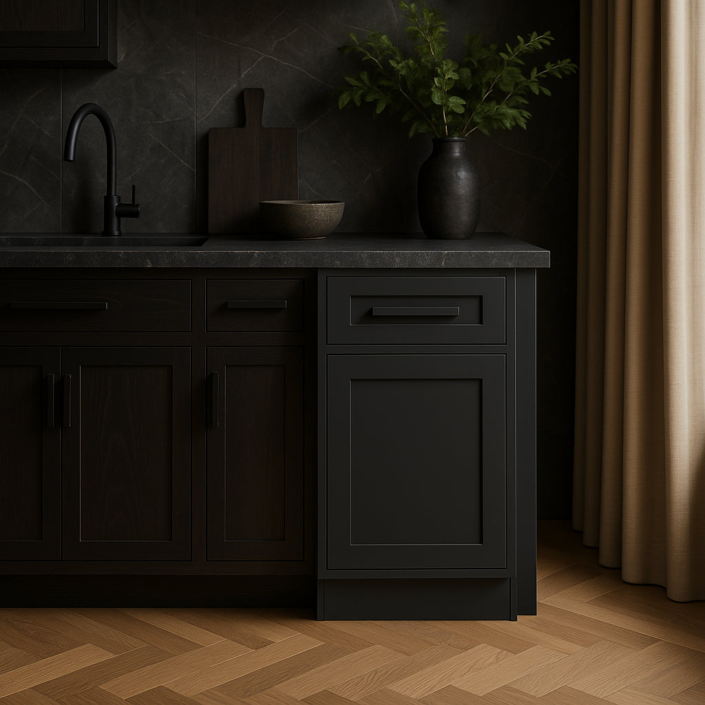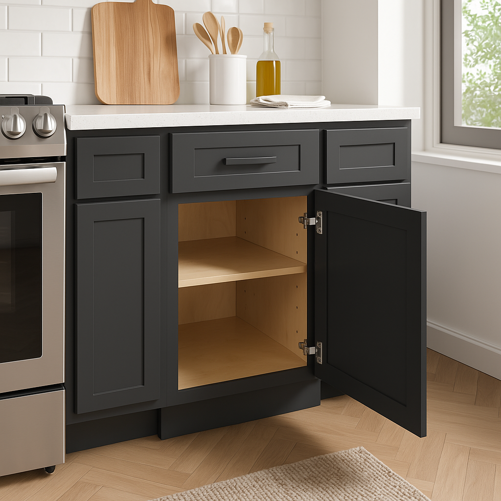 The Grayson Base Kitchen Cabinet in Deep Onyx combines robust plywood construction with a sophisticated painted finish. Featuring soft-close doors and drawers, it offers both style and functionality, making it an ideal choice for modern kitchens.
