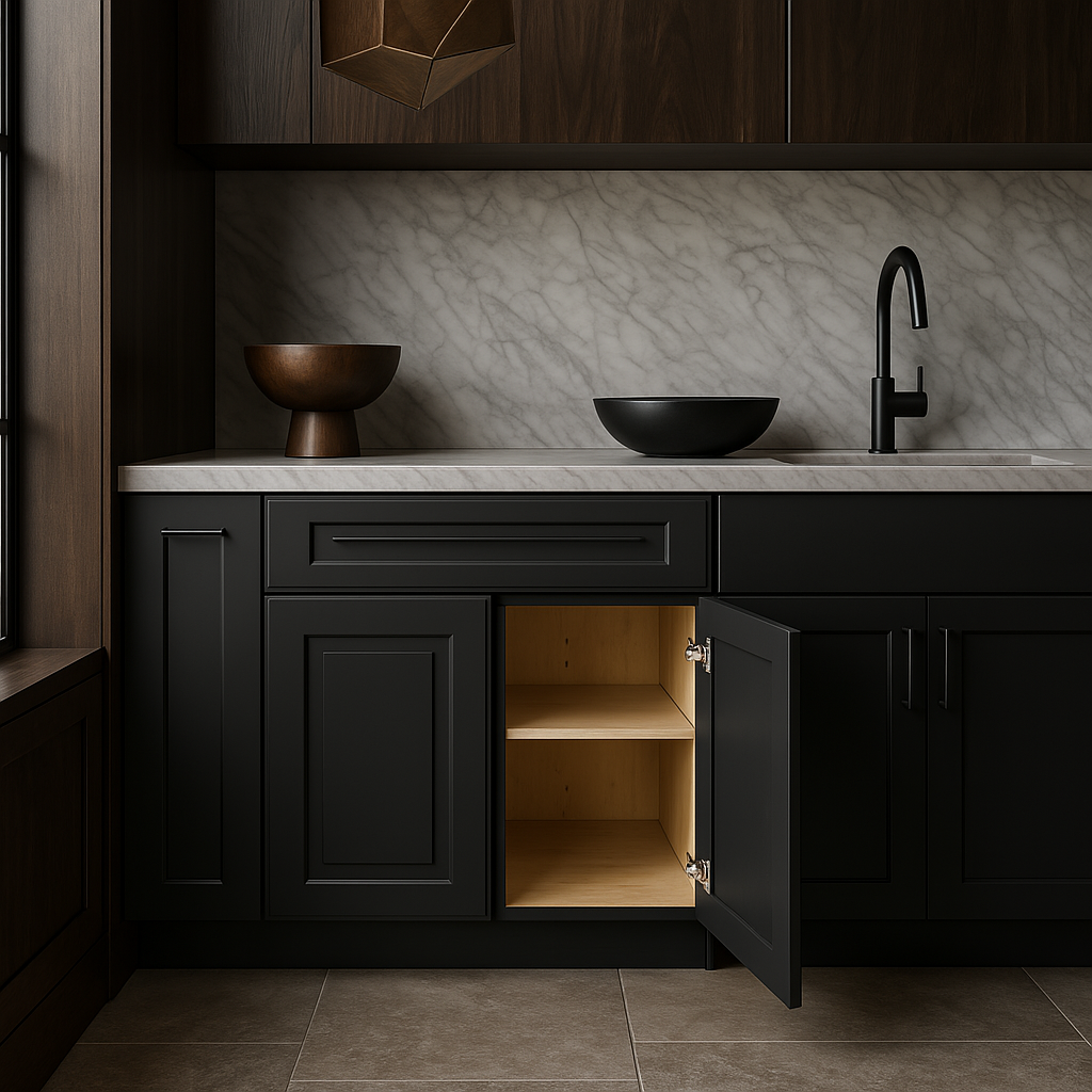The Grayson Base Kitchen Cabinet is a masterpiece of design, blending the bold Deep Onyx finish with a timeless shaker style. Its raised center panel adds depth and character, making it a focal point in any kitchen. Pair it with brushed stainless steel appliances and light countertops for a striking contrast that exudes sophistication. This cabinet is not just a storage solution; it's a statement piece that transforms your kitchen into a luxurious haven.