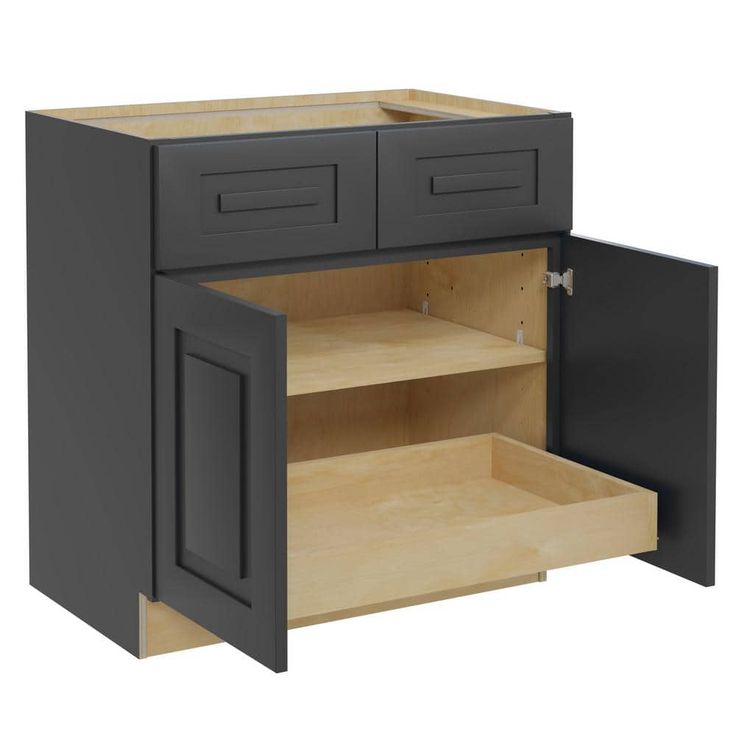 The Grayson 33-inch Plywood Base Kitchen Cabinet in Deep Onyx elevates any kitchen with its robust and stylish design. Crafted from durable plywood, it features soft-close doors and drawers, ensuring both functionality and quiet elegance. Perfect for pros and DIY enthusiasts, its transitional Shaker style with a dark gray finish offers timeless appeal.