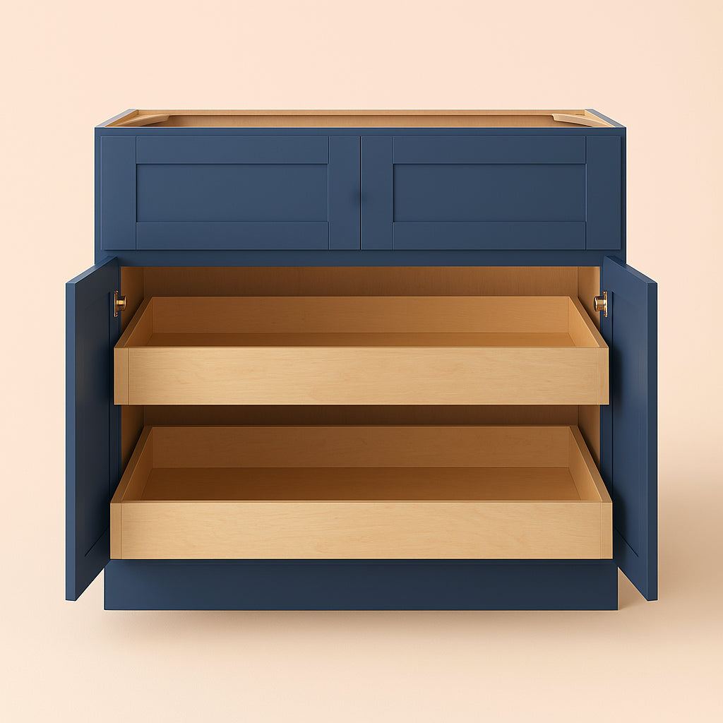 The Washington Vessel Blue Shaker Cabinet combines modern aesthetics with durable construction. Featuring a striking blue vinyl finish, soft-close doors, and CARB II compliant plywood, it offers both style and practicality for your kitchen.