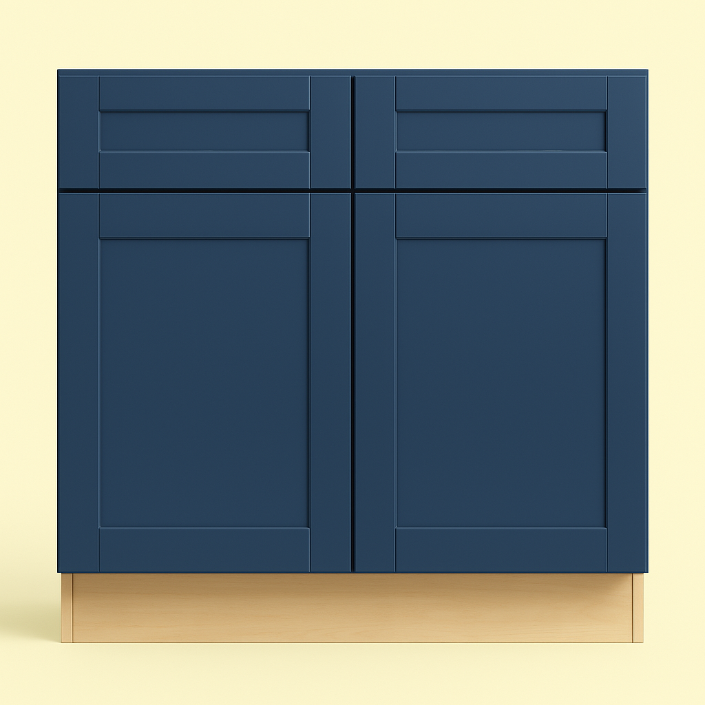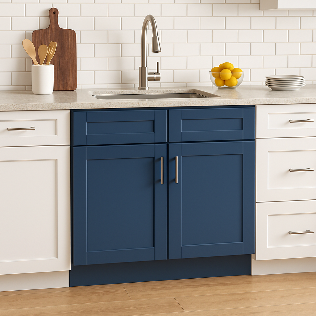 The Washington Vessel Blue Shaker Base Kitchen Cabinet combines modern style with superior functionality. Featuring CARB II compliant plywood construction and a stunning blue vinyl finish, it offers durability and a contemporary flair for any kitchen.