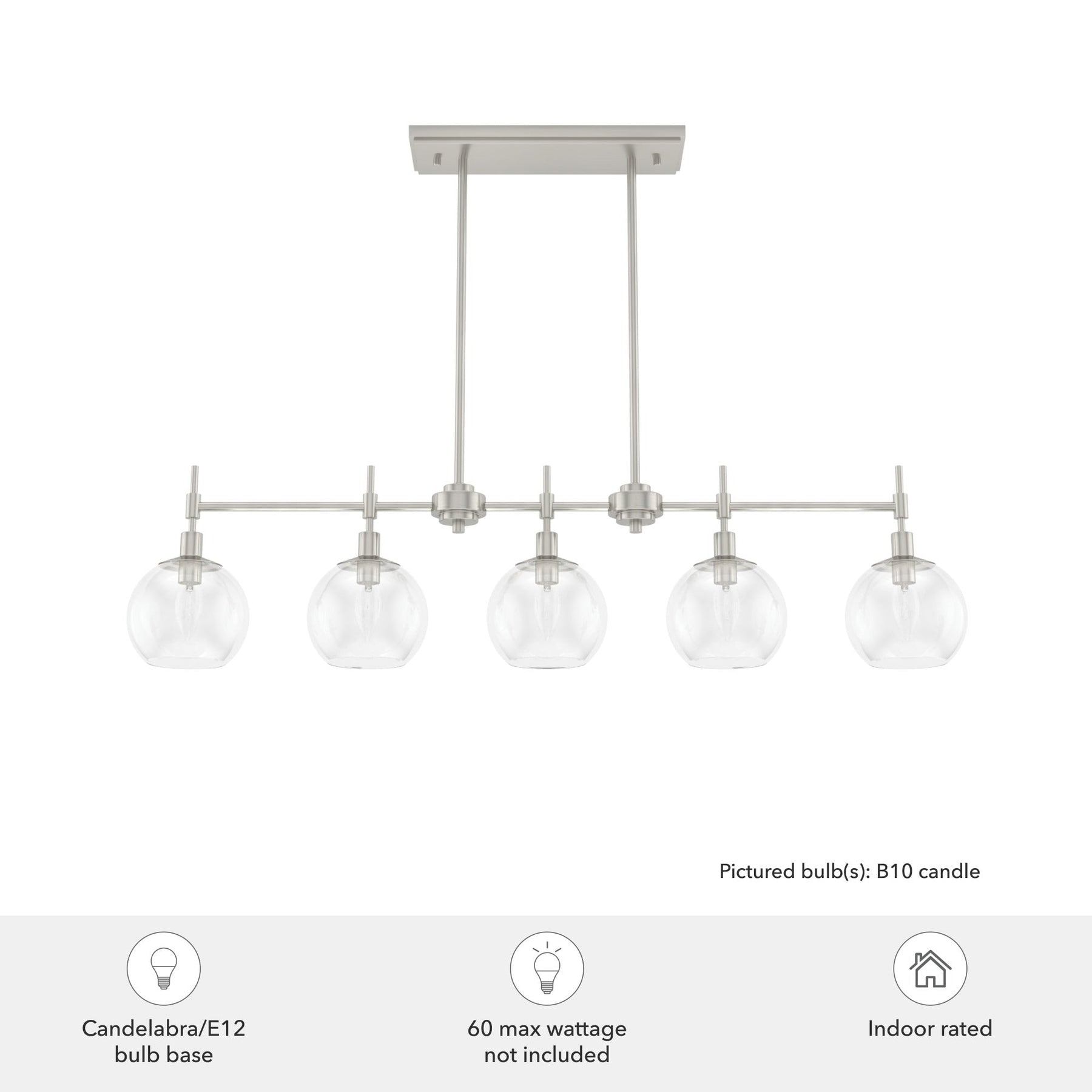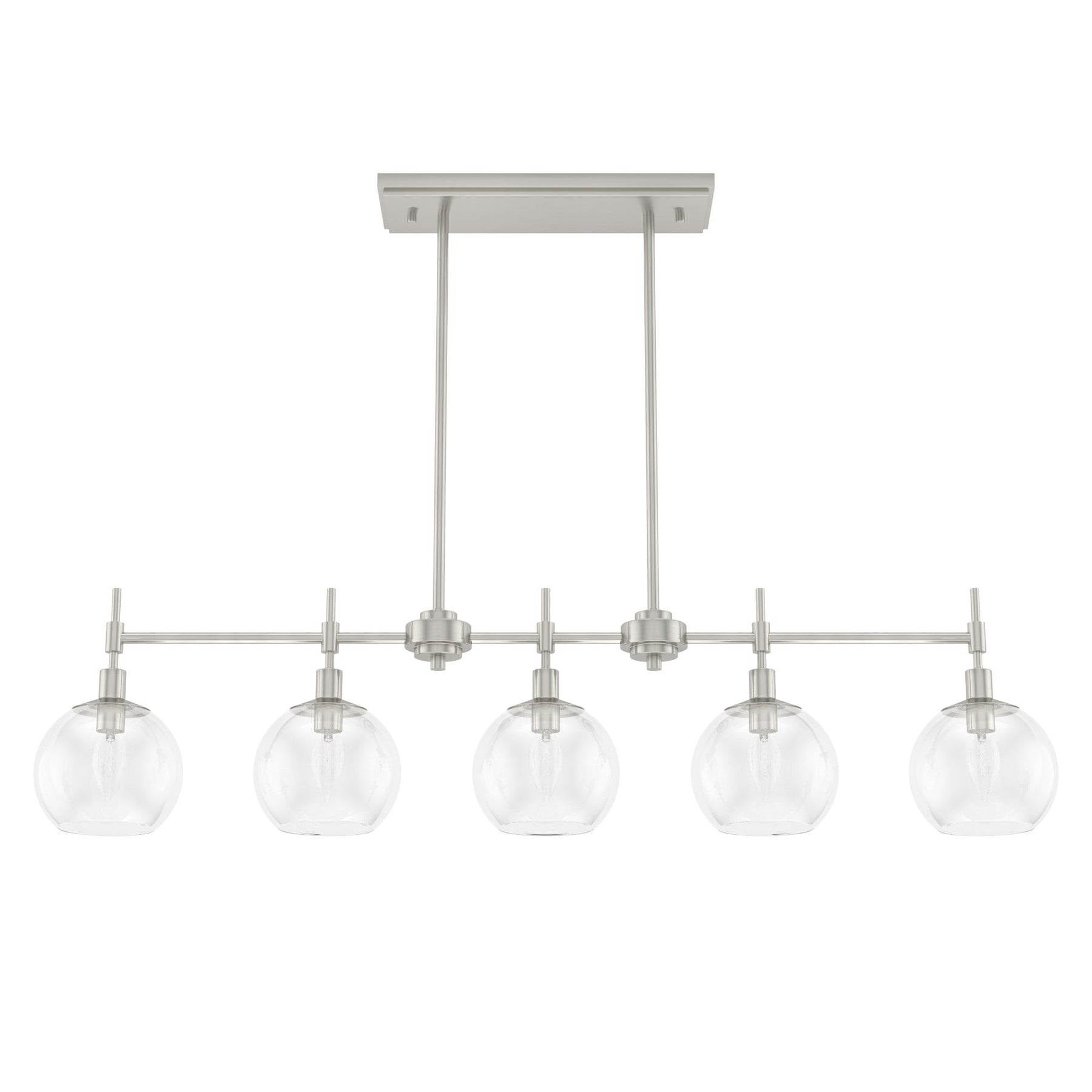 Illuminate your space with the Hunter Xidane 5-Light Brushed Nickel Mid-century LED Crystal Chandelier. This striking fixture features an elegant mid-century design with a brushed nickel finish and clear glass shades, perfect for adding a touch of glamour to any room. Built for easy installation and enduring style, it is designed to elevate kitchens, dining rooms, and more with its radiant glow.