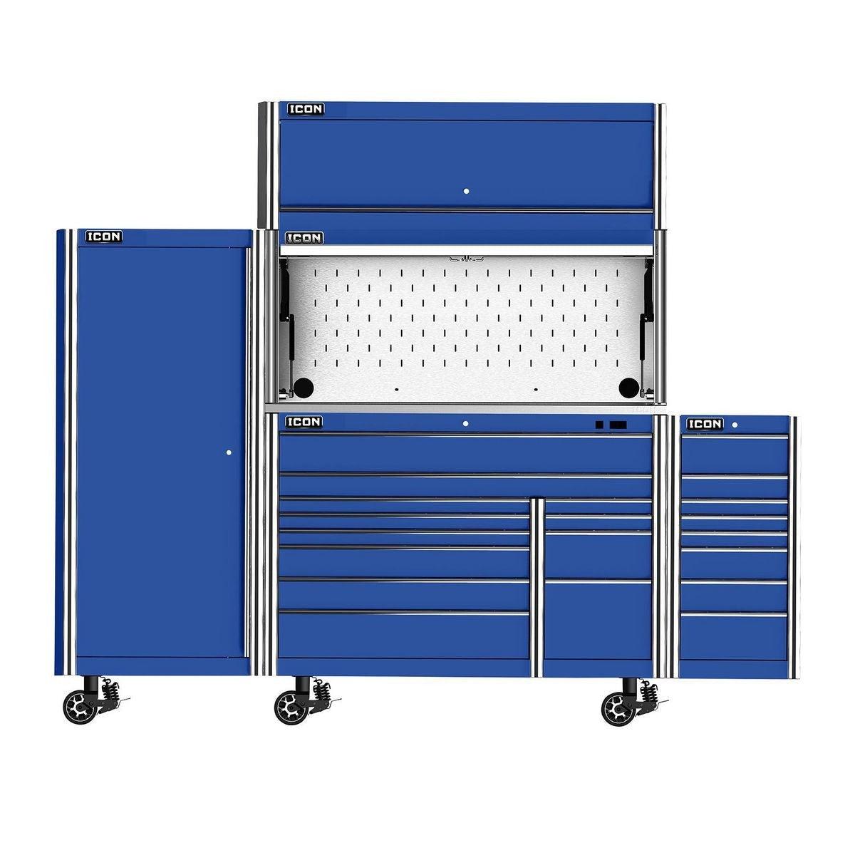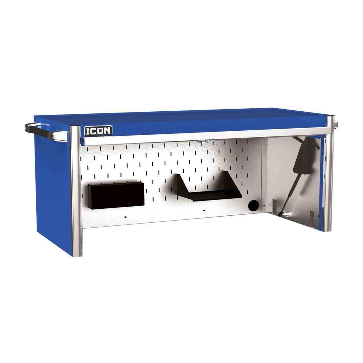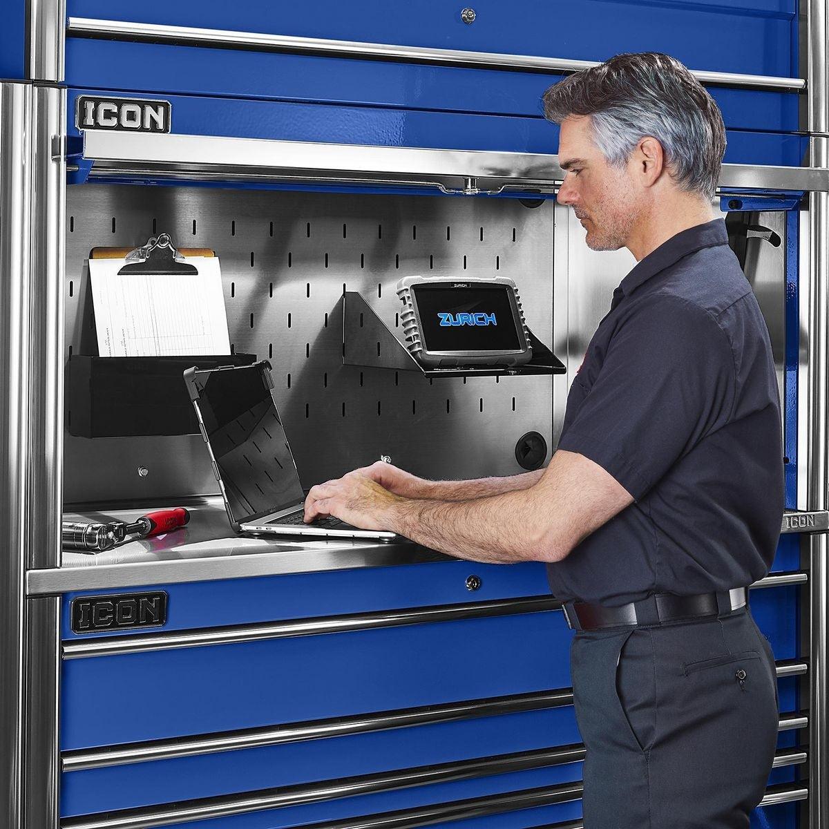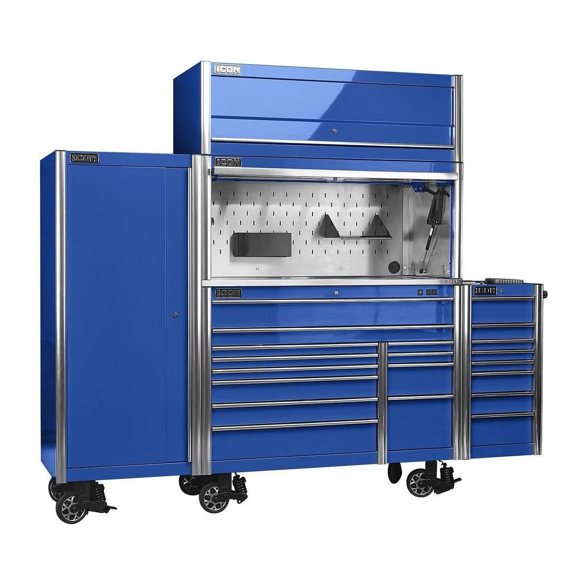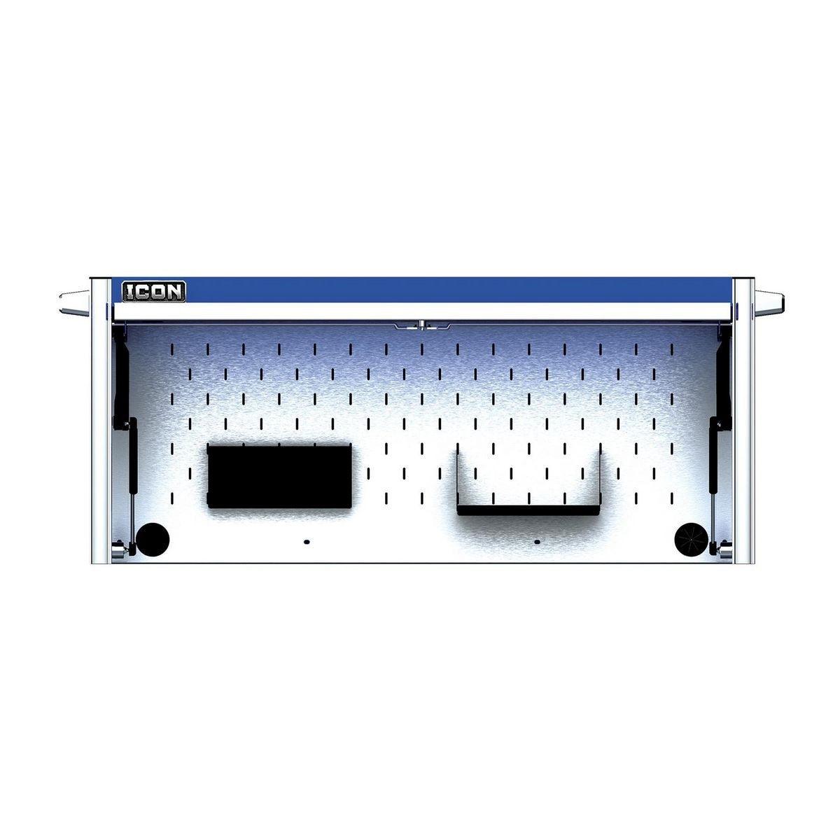 The Icon™ Professional Work Center Hutch provides a functional work area and lockable storage space for maximum security. It’s loaded with features like power access ports, an easy-open pneumatic assist door and a stainless steel slot-wall that’s compatible with Icon™ tool holders and shelves. All Icon™ work centers can be enhanced with a 48-inch LED light bar with 3,000 lumens that lights automatically when the door is open. Includes a durable slot wall for hanging and arranging tools, including one Aerosol Can Holder and Document Shelf. Icon™ Work Center Hutches are fully modular working with 56 in. and 73 in. systems. All Icon™ storage comes with free door-to-door delivery and a lifetime warranty - plus, a full line of replacement parts is available. It’s the only storage solution you’ll ever need. A stainless top is required to use the Work Center Hutch.