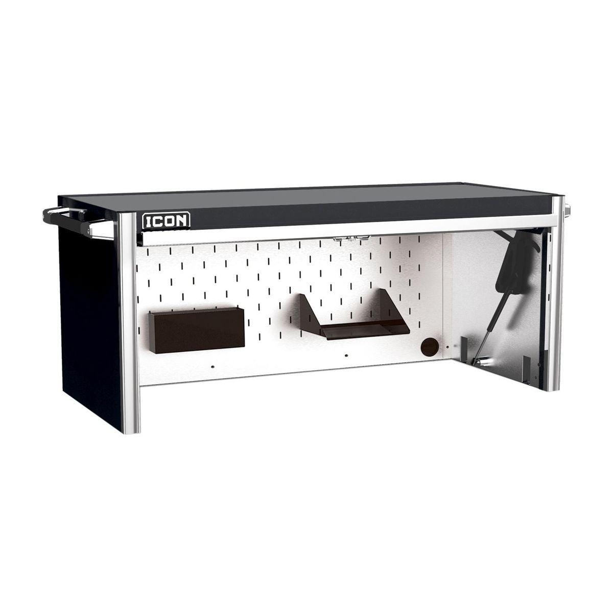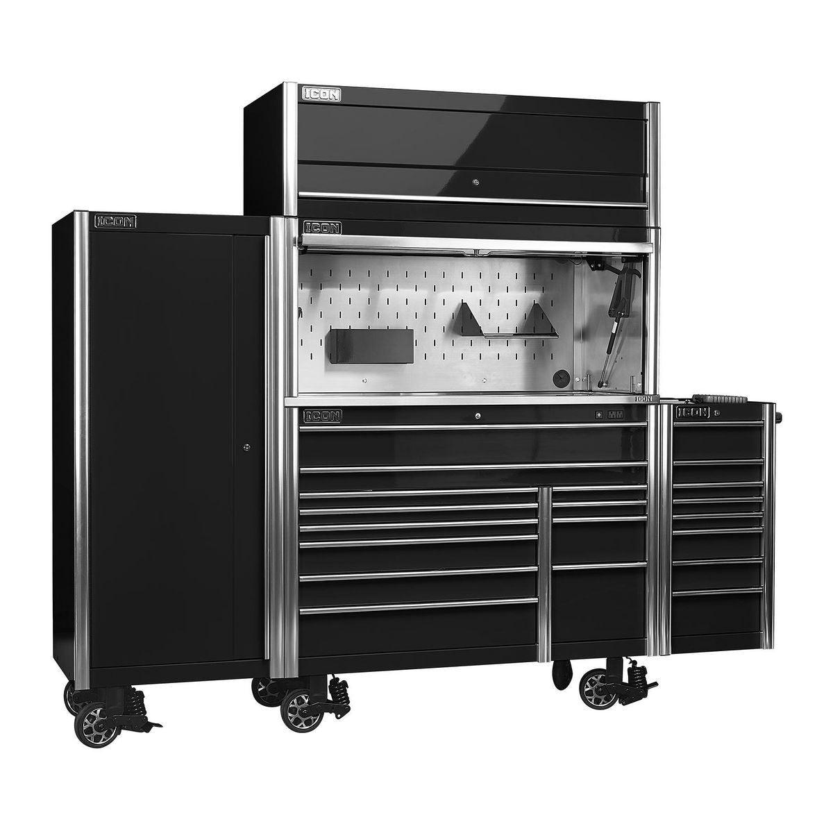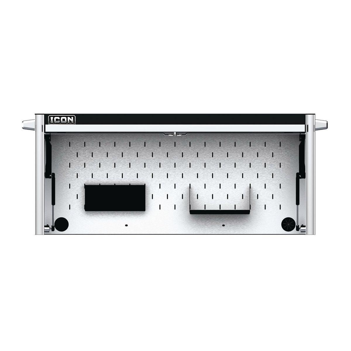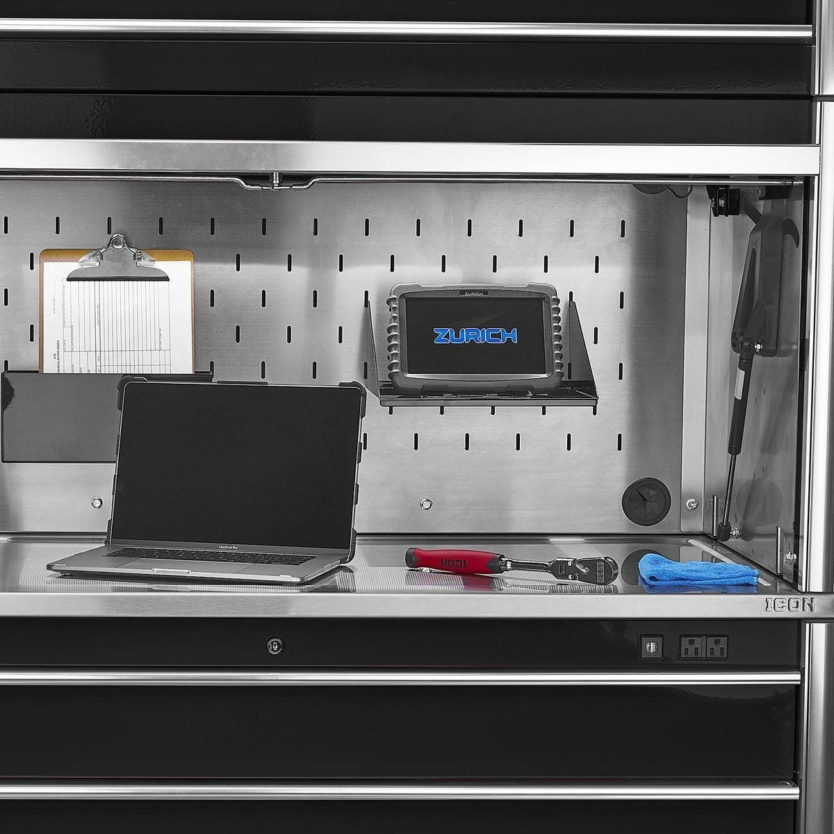 The Icon™ Professional Work Center Hutch provides a functional work area and lockable storage space for maximum security. It’s loaded with features like power access ports, an easy-open pneumatic assist door and a stainless steel slot-wall that’s compatible with Icon™ tool holders and shelves. All Icon™ work centers can be enhanced with a 48-inch LED light bar with 3,000 lumens that lights automatically when the door is open. Includes a durable slot wall for hanging and arranging tools, including one Aerosol Can Holder and Document Shelf. Icon™ Work Center Hutches are fully modular working with 56 in. and 73 in. systems. All Icon™ storage comes with free door-to-door delivery and a lifetime warranty - plus, a full line of replacement parts is available. It’s the only storage solution you’ll ever need. A stainless top is required to use the Work Center Hutch.