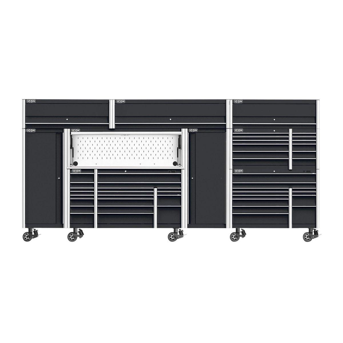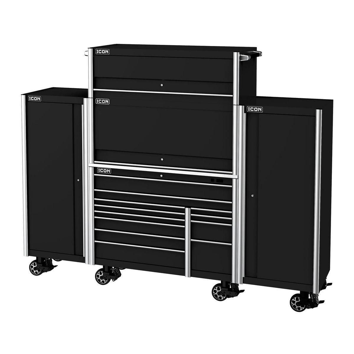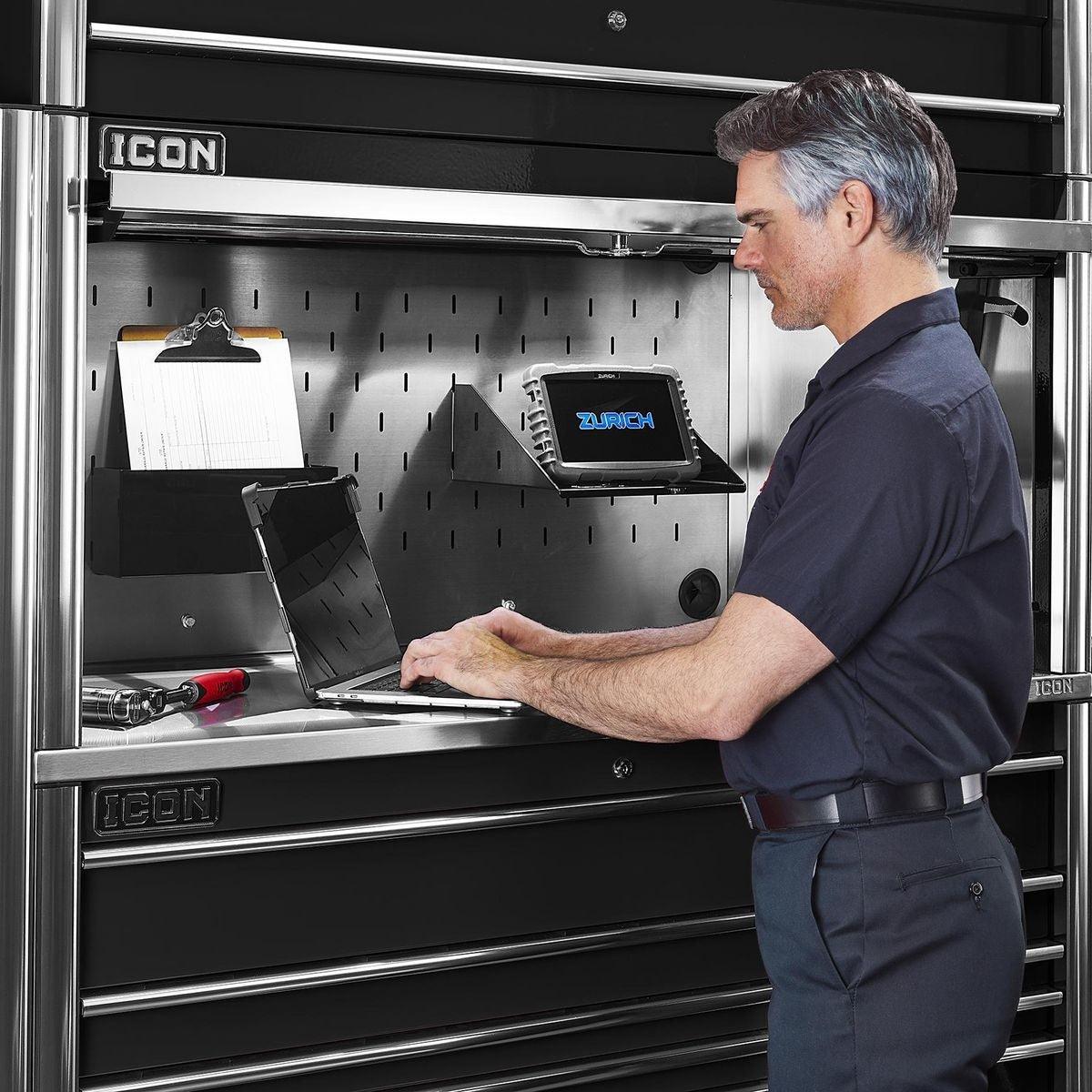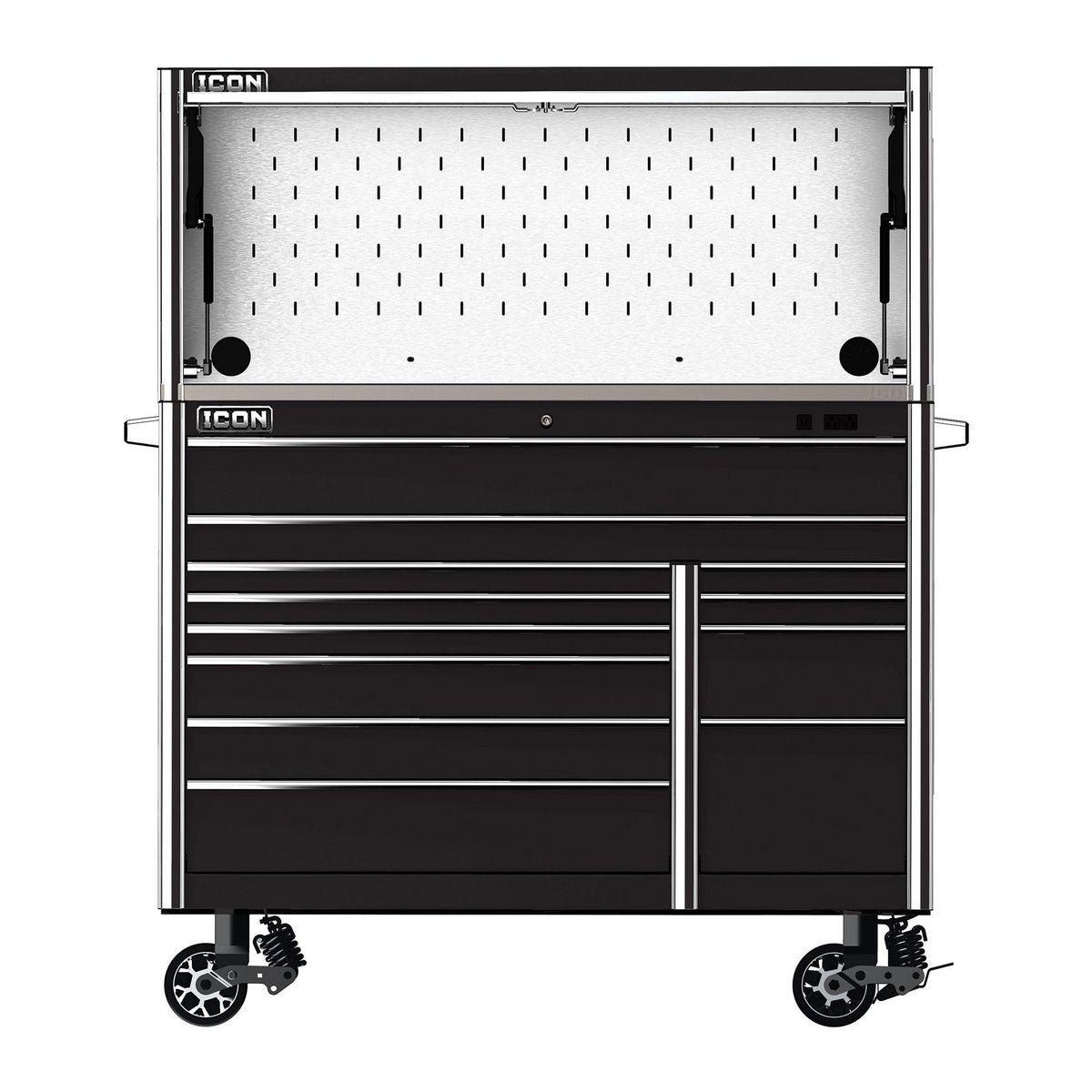 The Icon™ Professional Work Center Hutch provides a functional work area and lockable storage space for maximum security. It’s loaded with features like power access ports, an easy-open pneumatic assist door and a stainless steel slot-wall that’s compatible with Icon™ tool holders and shelves. All Icon™ work centers can be enhanced with a 48-inch LED light bar with 3,000 lumens that lights automatically when the door is open. Includes a durable slot wall for hanging and arranging tools, including one Aerosol Can Holder and Document Shelf. Icon™ Work Center Hutches are fully modular working with 56 in. and 73 in. systems. All Icon™ storage comes with free door-to-door delivery and a lifetime warranty - plus, a full line of replacement parts is available. It’s the only storage solution you’ll ever need. A stainless top is required to use the Work Center Hutch.