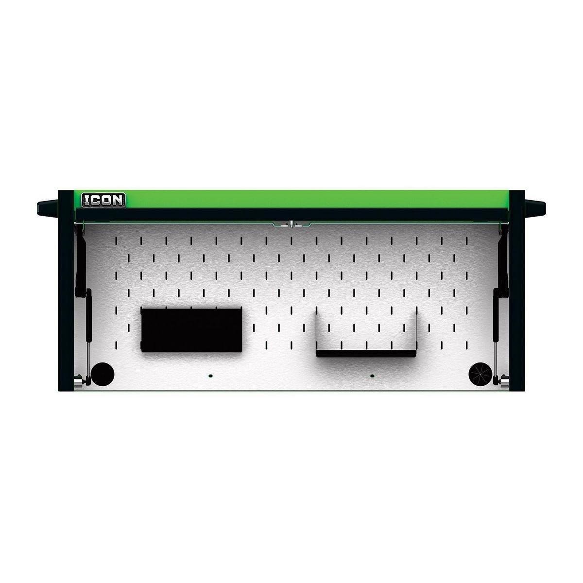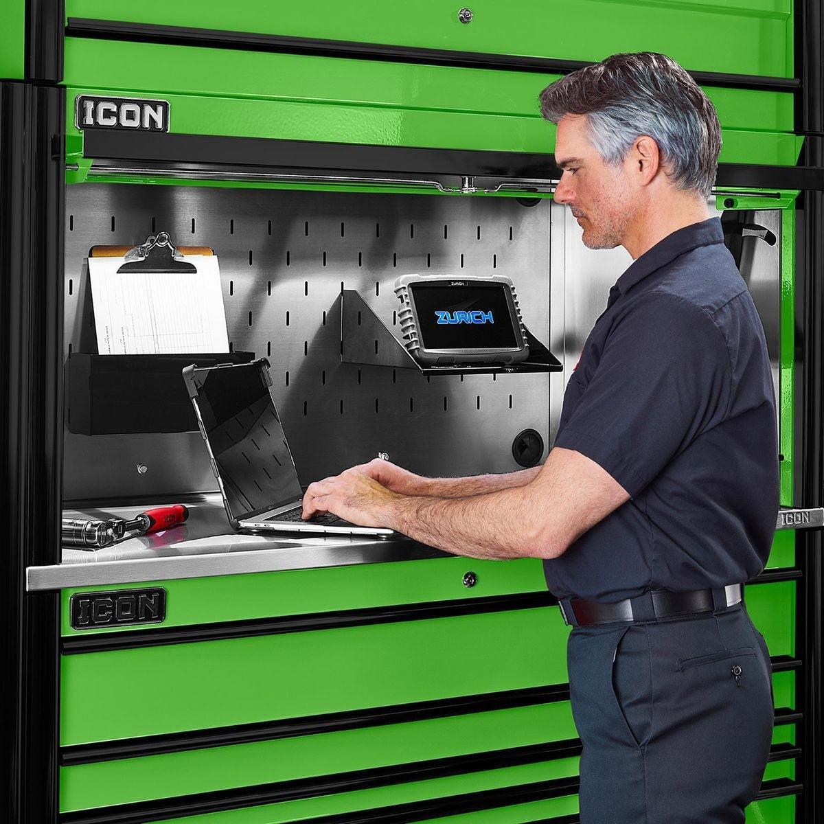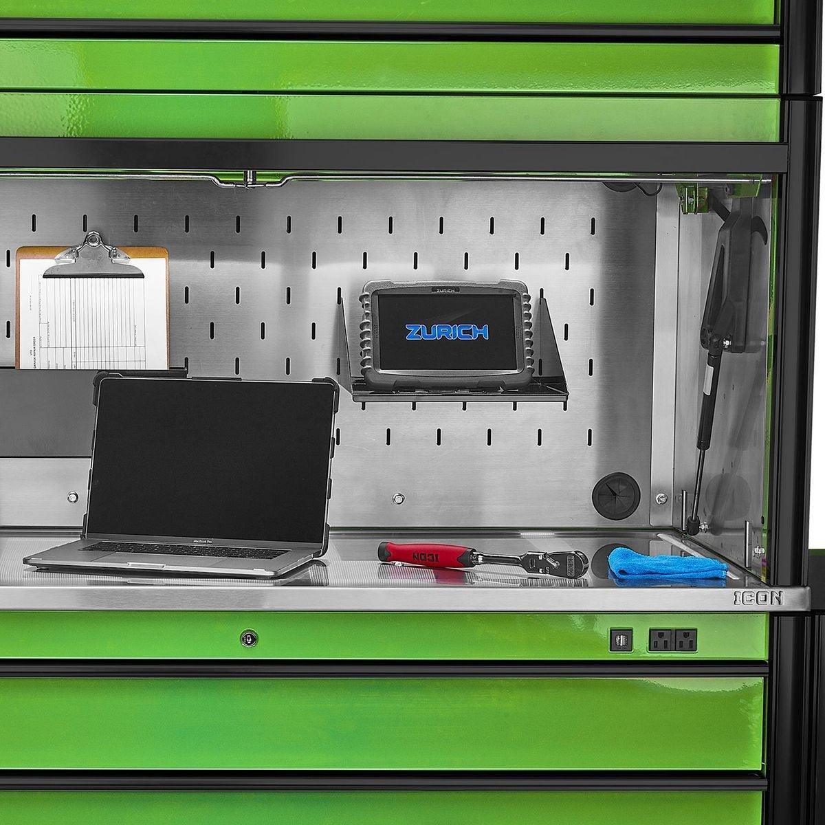The Icon™ Professional Work Center Hutch provides a functional work area and lockable storage space for maximum security. It’s loaded with features like power access ports, an easy-open pneumatic assist door and a stainless steel slot-wall that’s compatible with Icon™ tool holders and shelves. All Icon™ work centers can be enhanced with a 48-inch LED light bar with 3,000 lumens that lights automatically when the door is open. Includes a durable slot wall for hanging and arranging tools, including one Aerosol Can Holder and Document Shelf. Icon™ Work Center Hutches are fully modular working with 56 in. and 73 in. systems. All Icon™ storage comes with free door-to-door delivery and a lifetime warranty - plus, a full line of replacement parts is available. It’s the only storage solution you’ll ever need. A stainless top is required to use the Work Center Hutch.