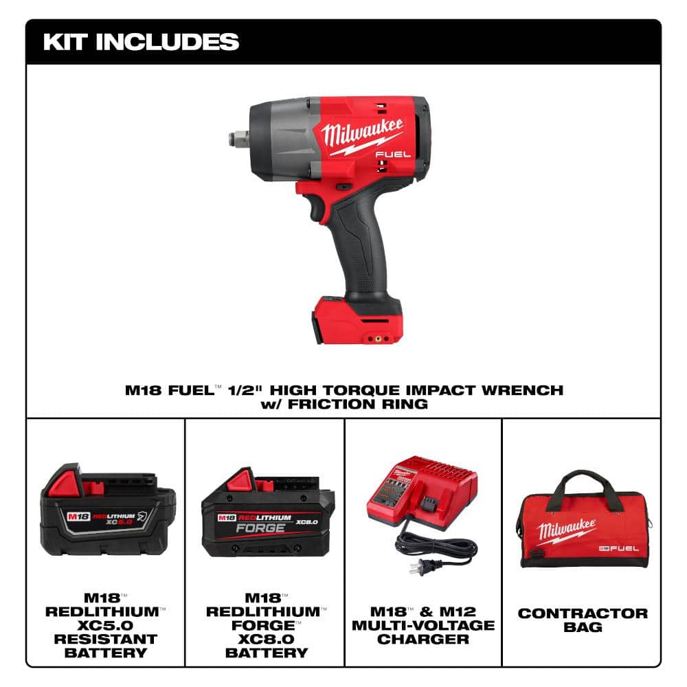 This Milwaukee M18 FUEL 1/2 in. impact wrench kit delivers up to 1,100 ft-lbs fastening and 1,500 ft-lbs nut-busting torque from a compact 7.6 in. body. The brushless motor, REDLINK PLUS intelligence, and REDLITHIUM XC5.0 battery provide fast removal speeds and durability, while the friction ring enables quick socket swaps. Includes a deep metric impact socket set to tackle a wide range of fastening tasks.