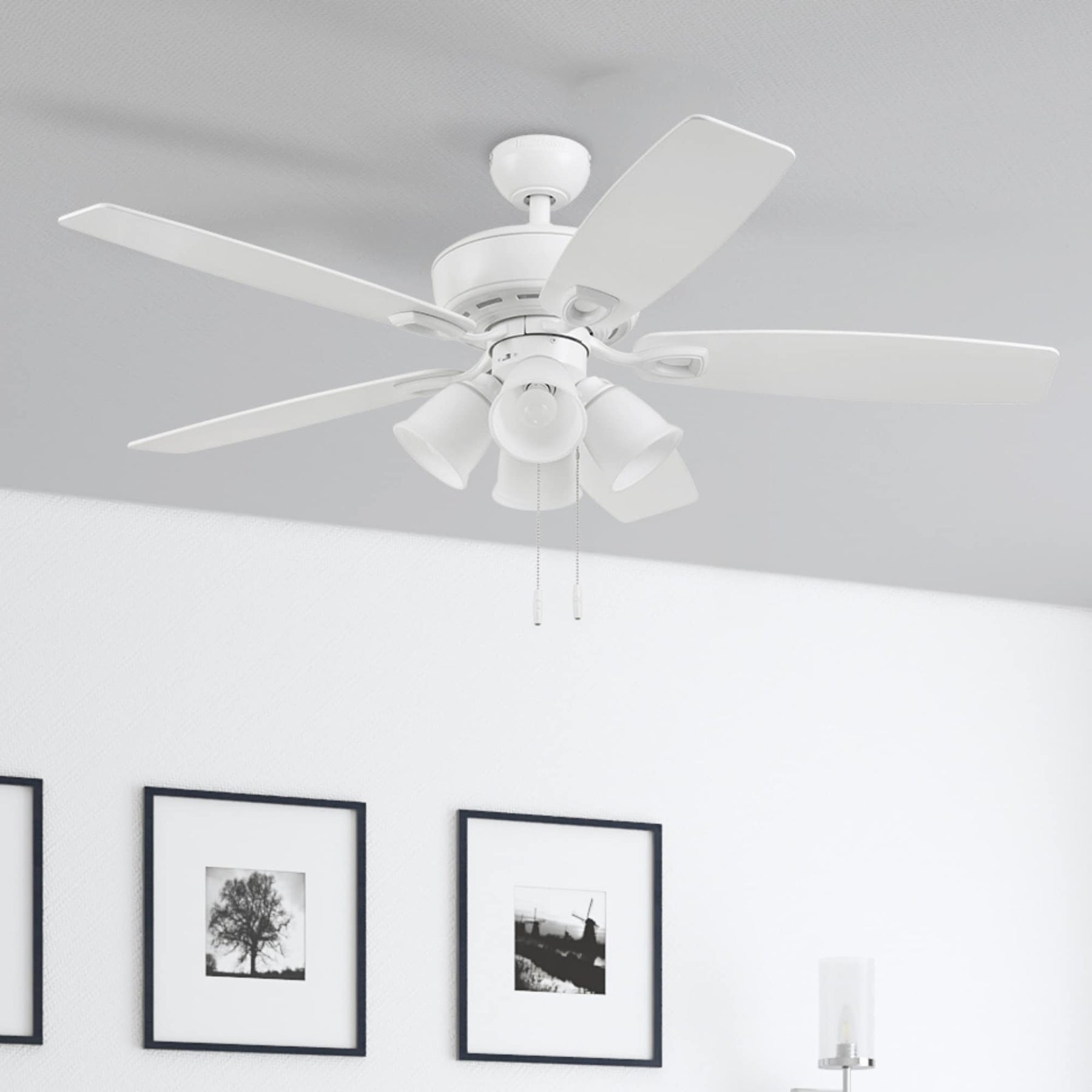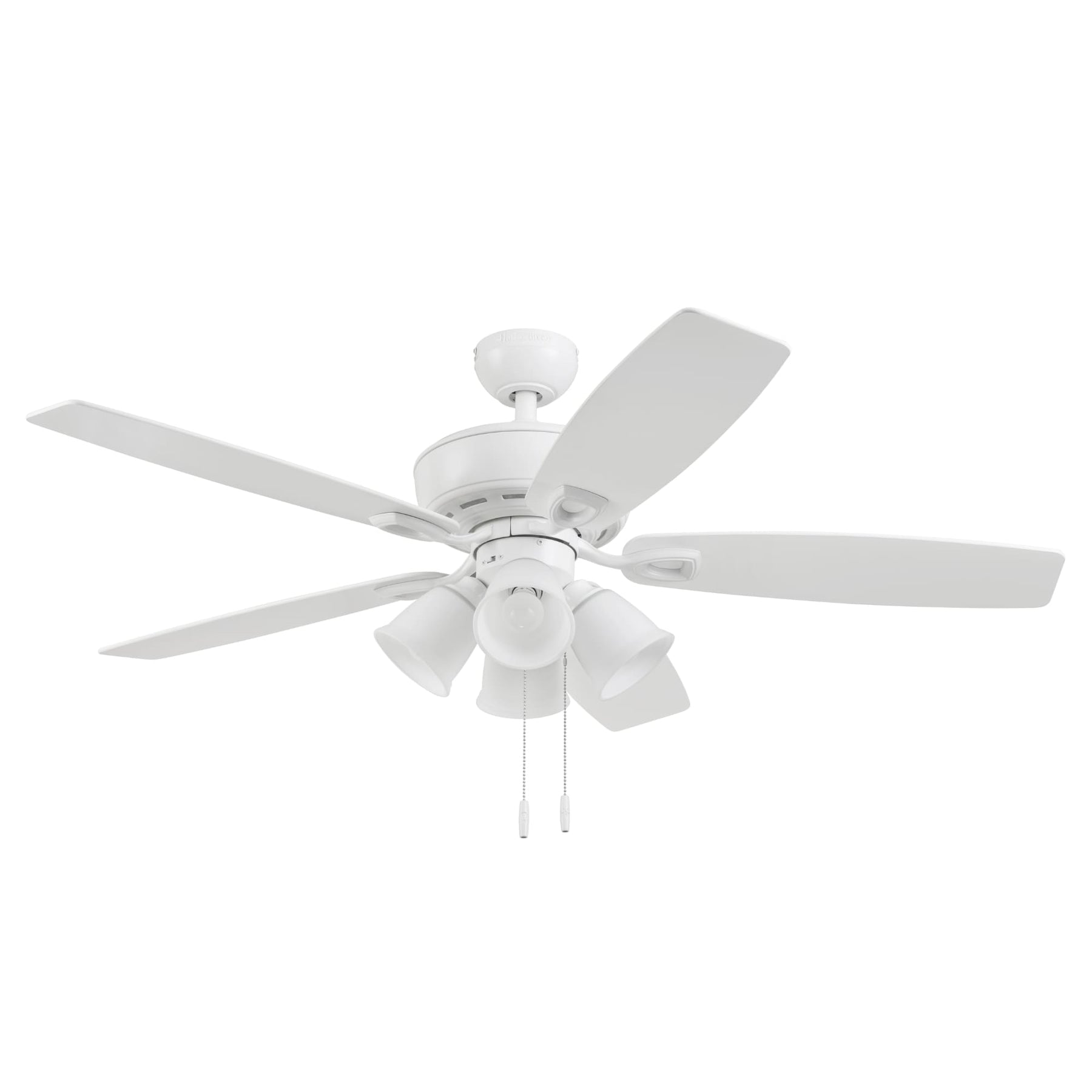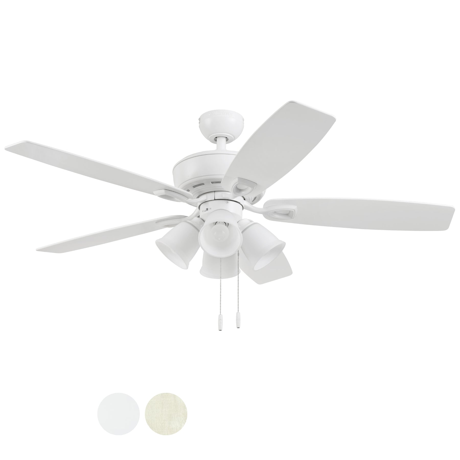 A versatile 52-inch indoor ceiling fan with a white finish and reversible white/driftwood blades. Includes a 4-arm frosted glass light kit with A15 LED bulbs and a reversible 3-speed AC motor for year-round comfort.