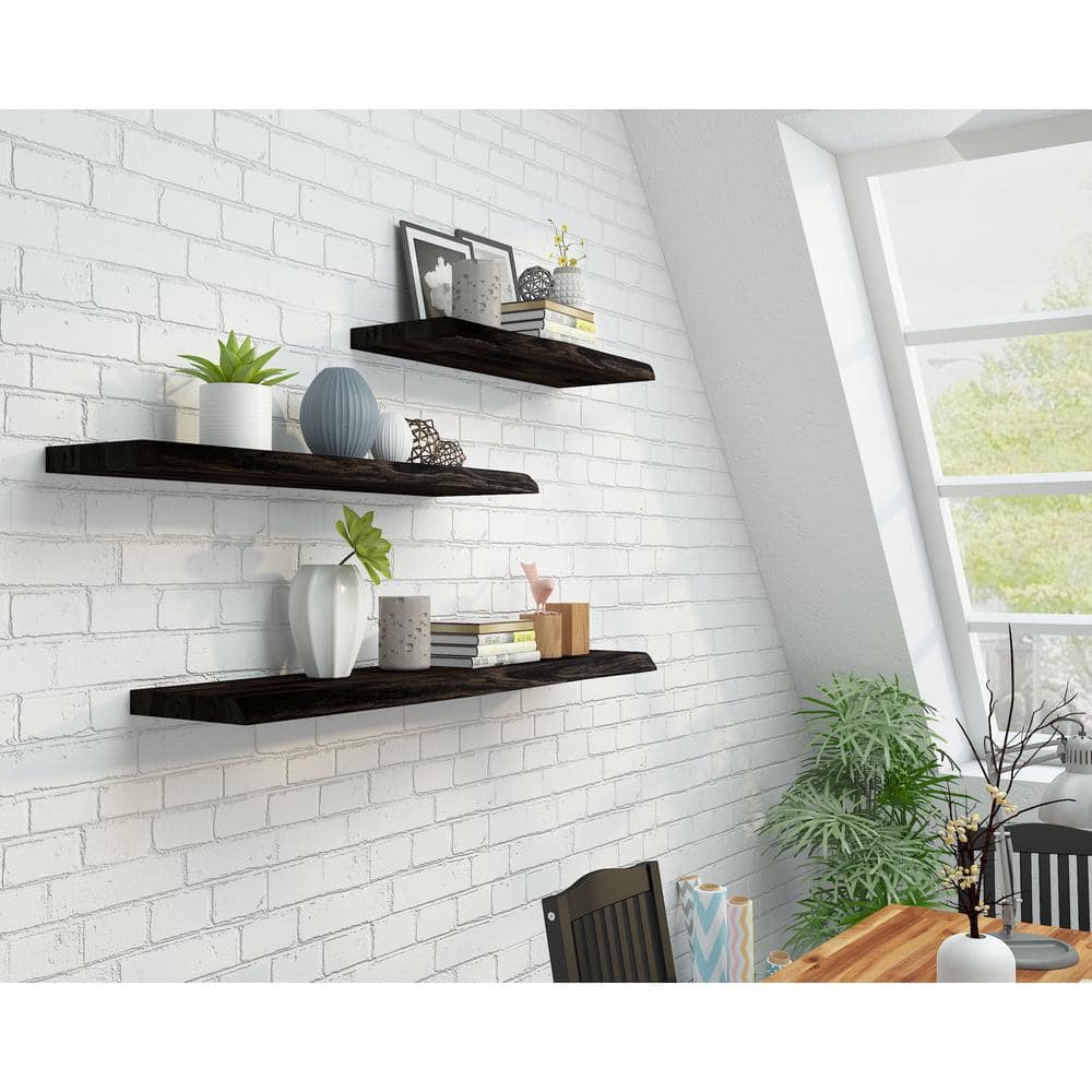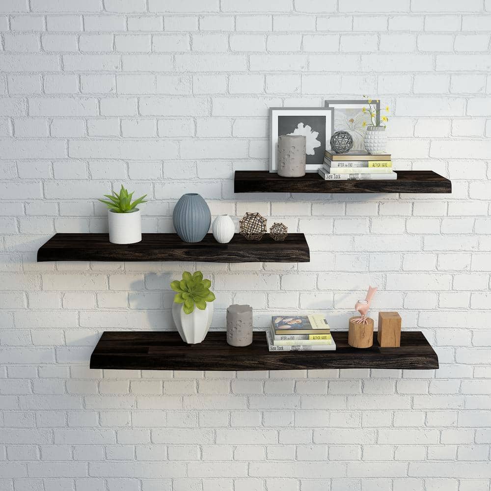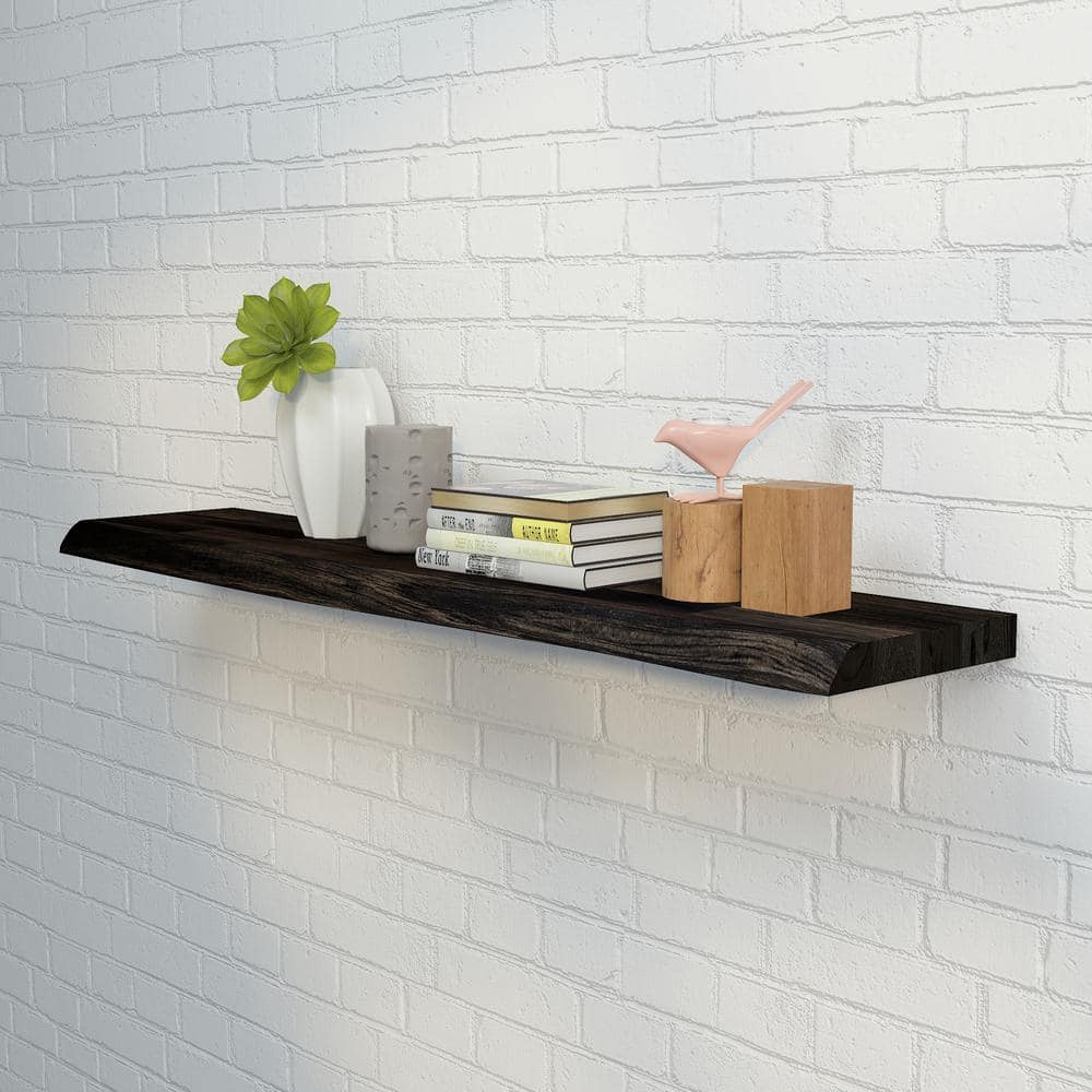 Interbuild Solid 3.9 ft. L x 10 in. D x 1.5 in. T, Acacia Butcher Block Floating Wall Shelf, Espresso with Live Edge