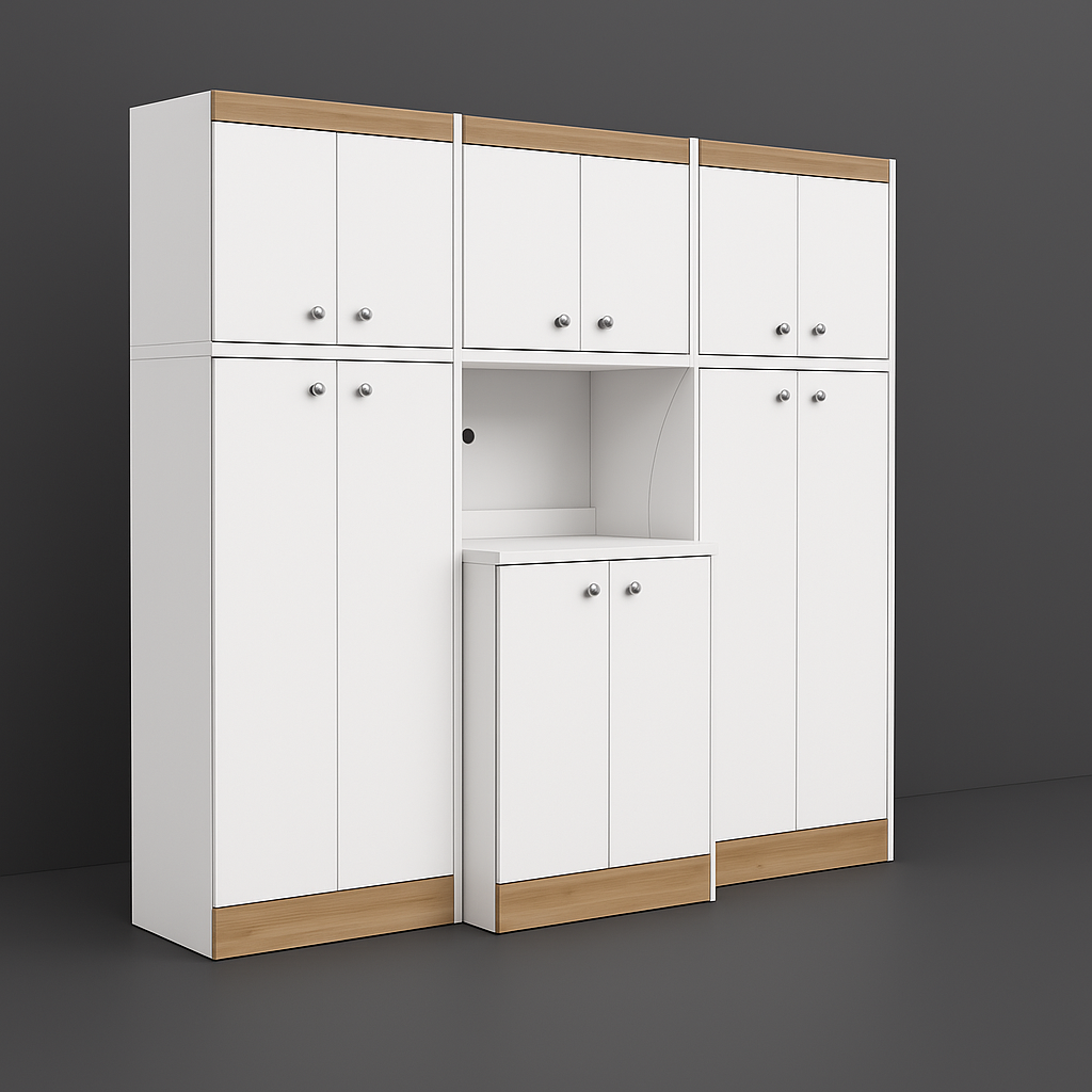 The Inval Kitchen Storage Utility Cabinet combines modern design with practical functionality. Featuring a durable laminate finish in White and Vienes Oak, this 3-piece cabinet offers ample storage space with adjustable shelves and concealed hinges. Perfect for organizing your kitchen or office break room.