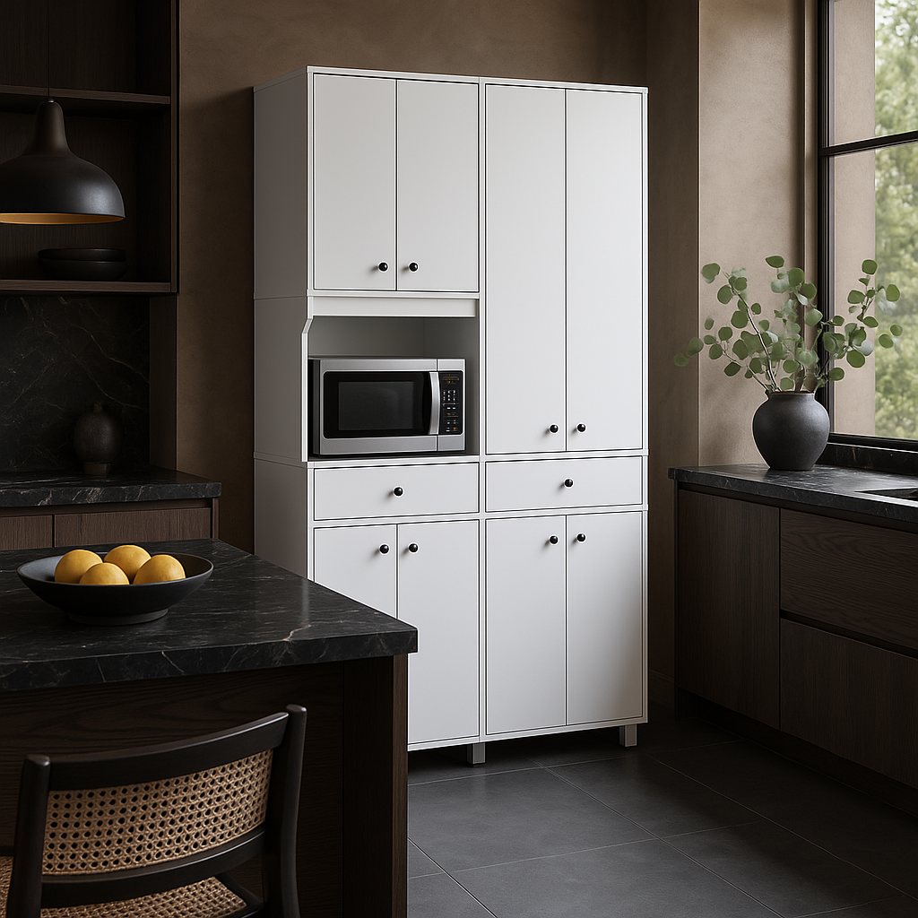 Transform your kitchen with this elegant utility cabinet, blending modern design with practical functionality. The sleek white laminate finish and brushed metal knobs add a touch of sophistication, while the adjustable shelves and spacious drawers provide versatile storage solutions. Style it with a chic microwave or coffee maker to create a functional yet stylish focal point. This cabinet is a must-have for a refined and organized kitchen space.