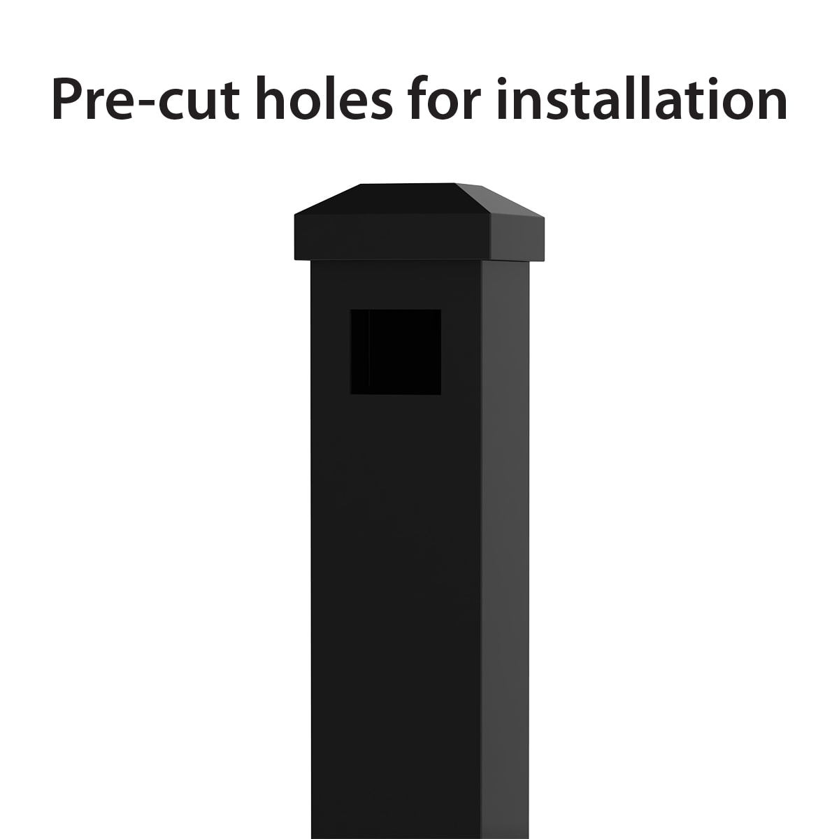 The Ironcraft 6-ft Black Aluminum Yard End Fence Post is designed for durability and elegance, featuring a black powder-coated finish that resists chipping and rust. This end post is perfect for completing your fence run or supporting your gate, with pre-punched holes for easy installation and a flat post cap included for a polished look.