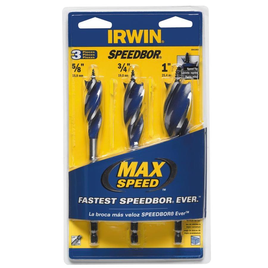 IRWIN 3-pack Tri-Flute bit set includes 5/8-in SPEEDBOR MAX, 3/4-in SPEEDBOR MAX and 1-in SPEEDBOR MAX, perfect for wood drilling applications