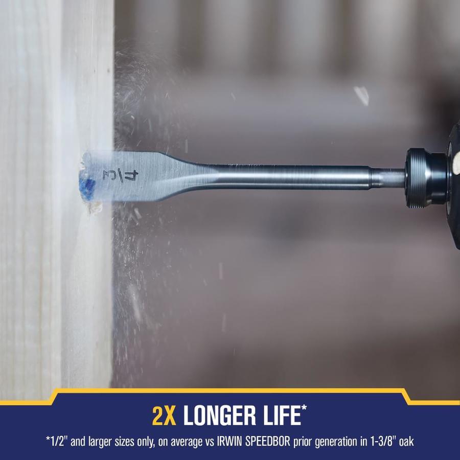 Drills holes 2X faster, more holes, less time Lasts 2X longer to get more done Chamfered cutting edges for increased durability Patented Blue Groove parabolic scoop for faster chip removal Designed for impact drivers with 1/4-in impact rated shank Drills faster on average versus IRWIN SPEEDBOR prior generation in 1-3/8in oak Application: Drilling holes through clean wood