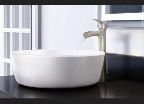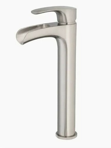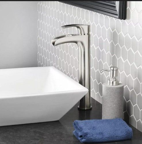 Sleek, tall single-handle vessel faucet in brushed nickel designed for modern bathroom sinks. WaterSense-certified for efficient performance and includes matching drain for a cohesive installation.
