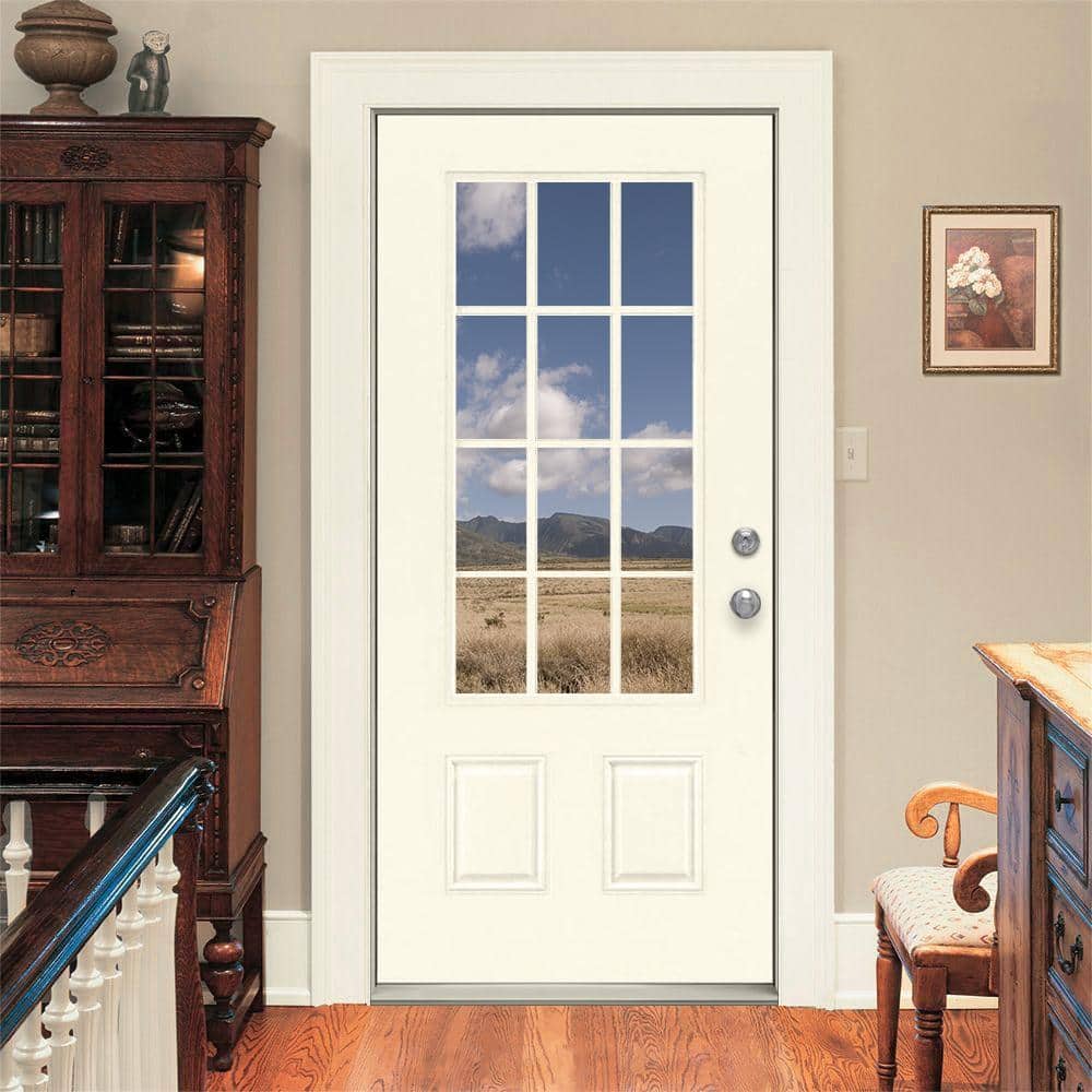 Durable, rust-resistant galvanized steel entry door prehung in a wood frame for easy installation. Features 12-lite clear tempered glass with divided-light grids and energy-efficient polystyrene core for insulation and longevity.