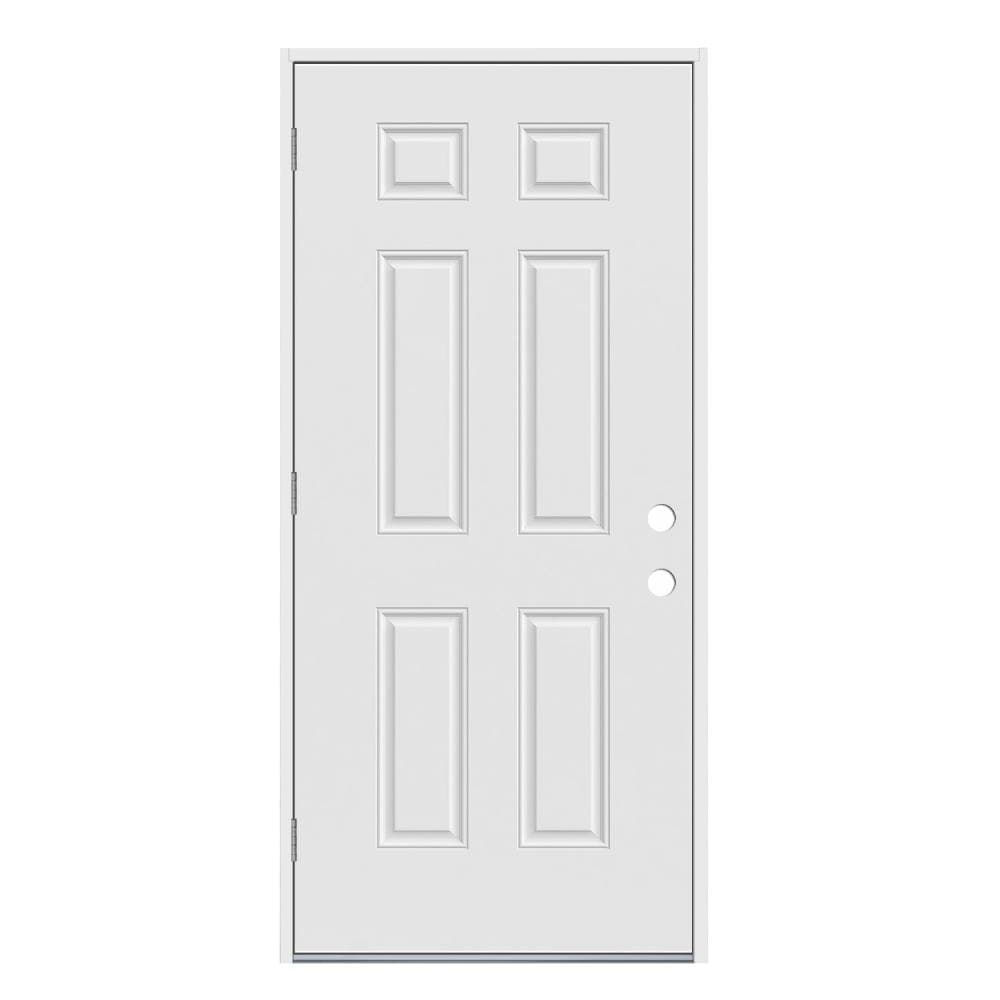 Durable steel prehung entry door with a fully insulated core for energy efficiency and noise reduction. Factory-primed and ready to paint, this right-hand outswing 6-panel door includes weatherstripping and a fixed sill for a secure, low-maintenance front or side entrance.