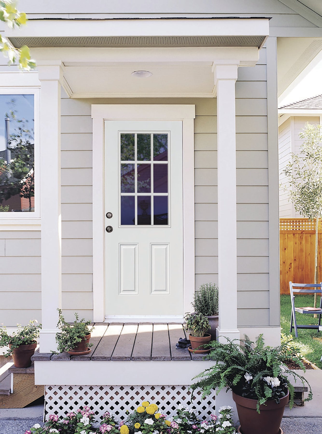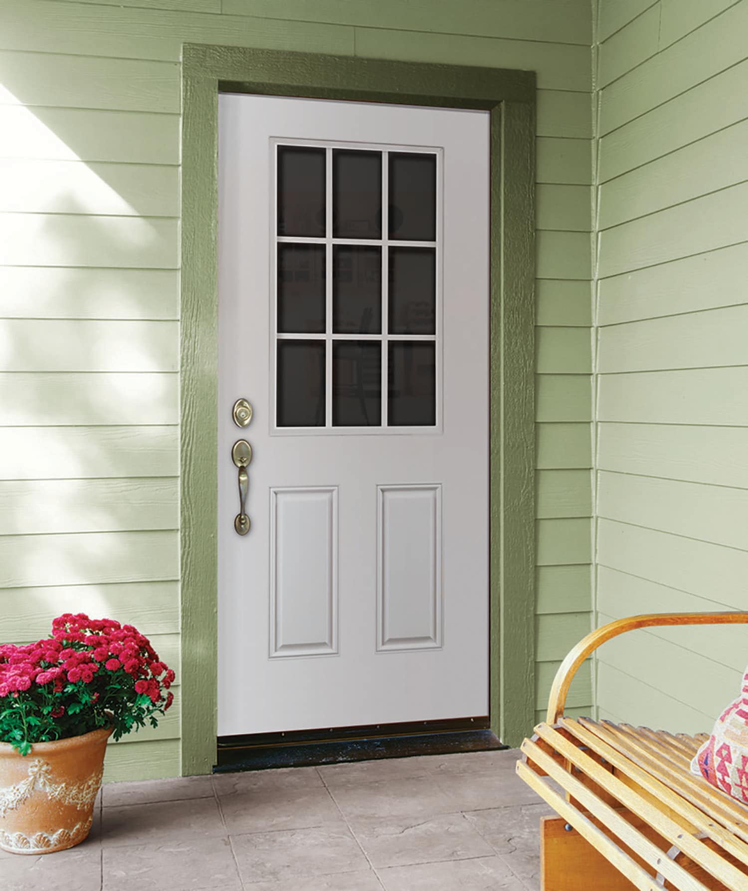 This entry door invites light with crisp, gridded glass while the sculpted two-panel base anchors the façade with quiet strength. The primed steel skin offers a flawless canvas—paint it a moody charcoal or a fresh sage to set the tone. Pair with satin nickel hardware and a leafy planter for a polished welcome. It’s an effortless upgrade that delivers everyday luxury and enduring curb appeal.