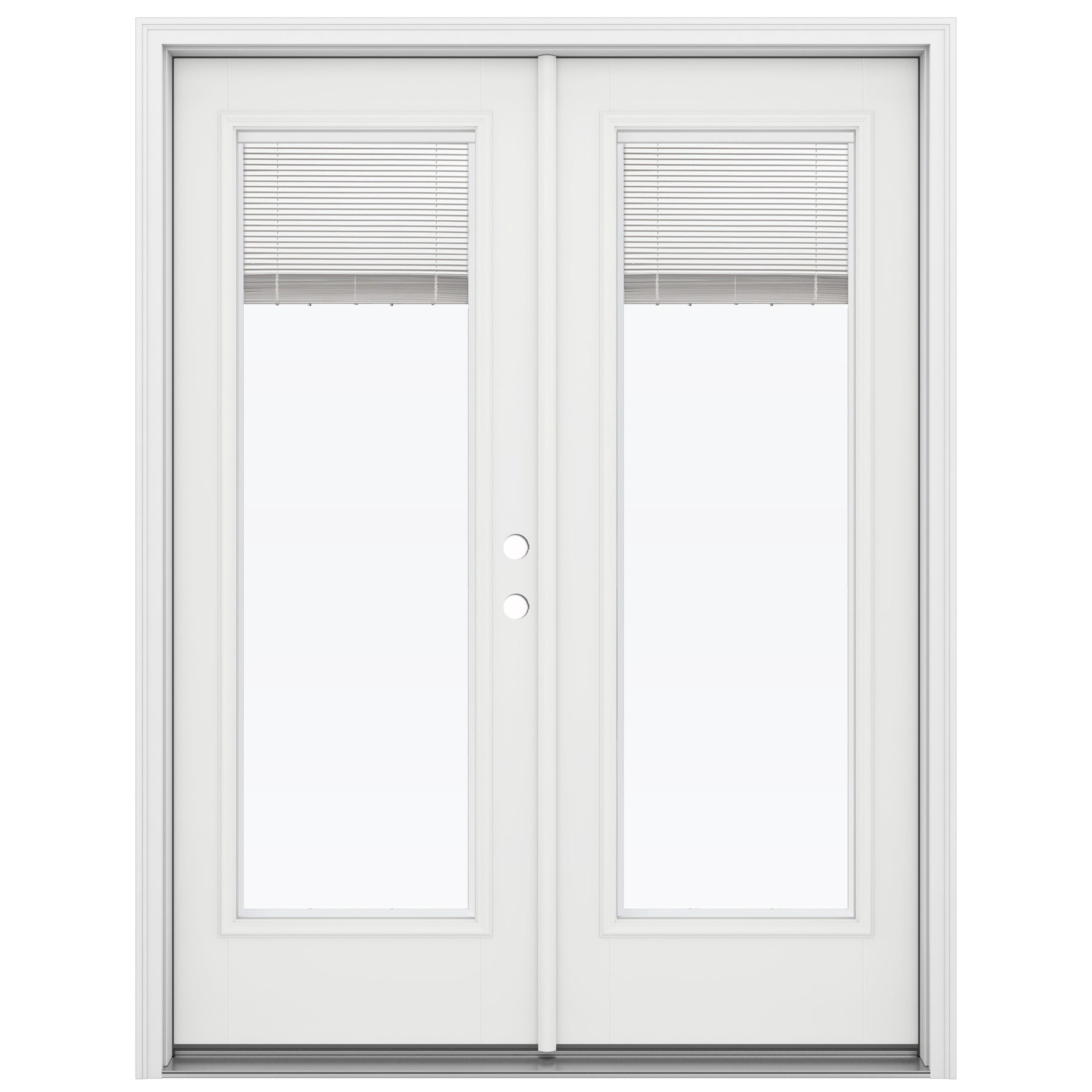 Energy-efficient fiberglass French patio door with Low-E tempered glass and maintenance-free blinds sealed between the glass. Left-hand inswing double-door design includes brickmould and primed surfaces ready for paint, offering durability that won’t dent, warp, or rot.
