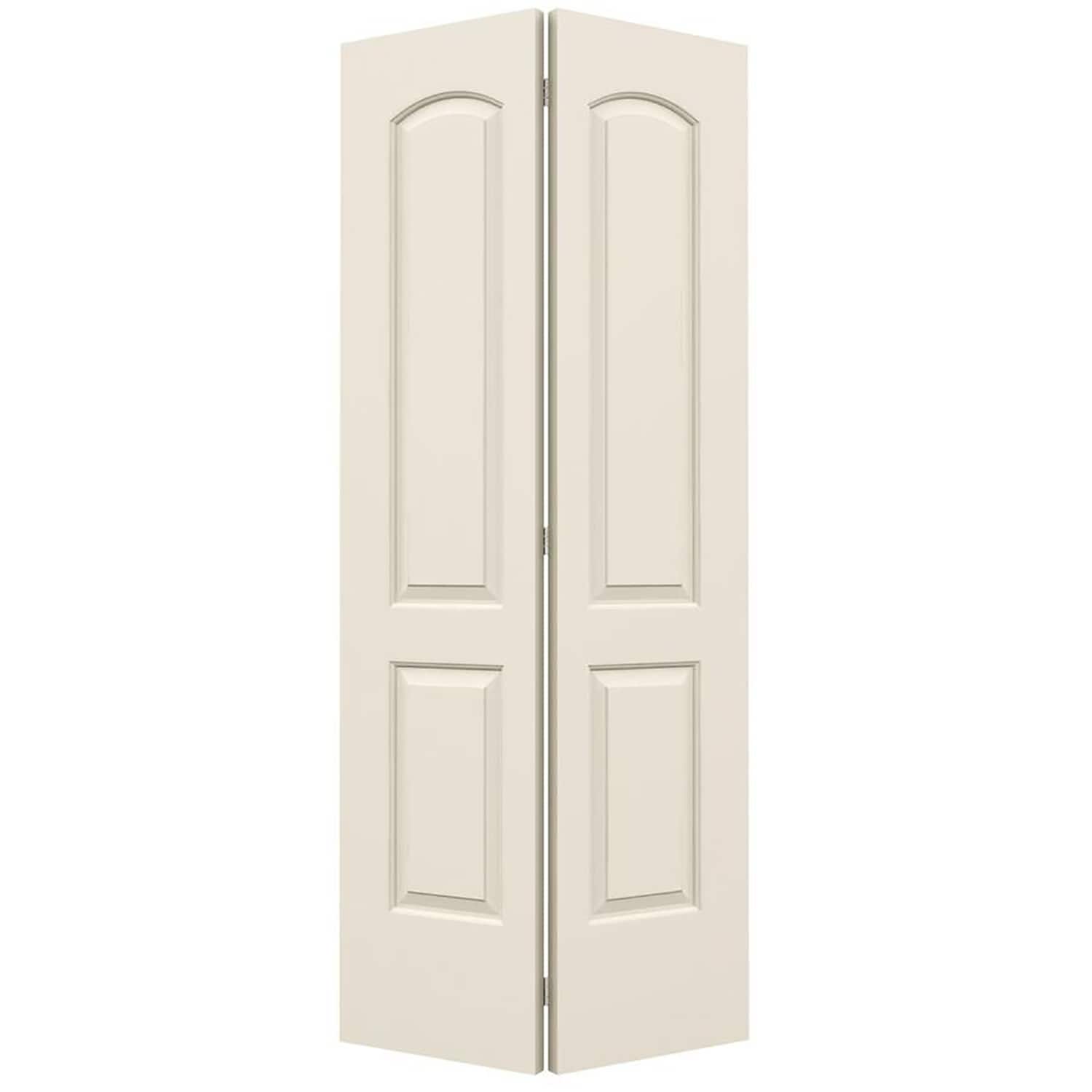 Classic 2-panel round-top bifold door made from molded composite with a smooth, primed finish ready for paint. Ideal for closets and pantries, it includes the track and hardware for straightforward installation.