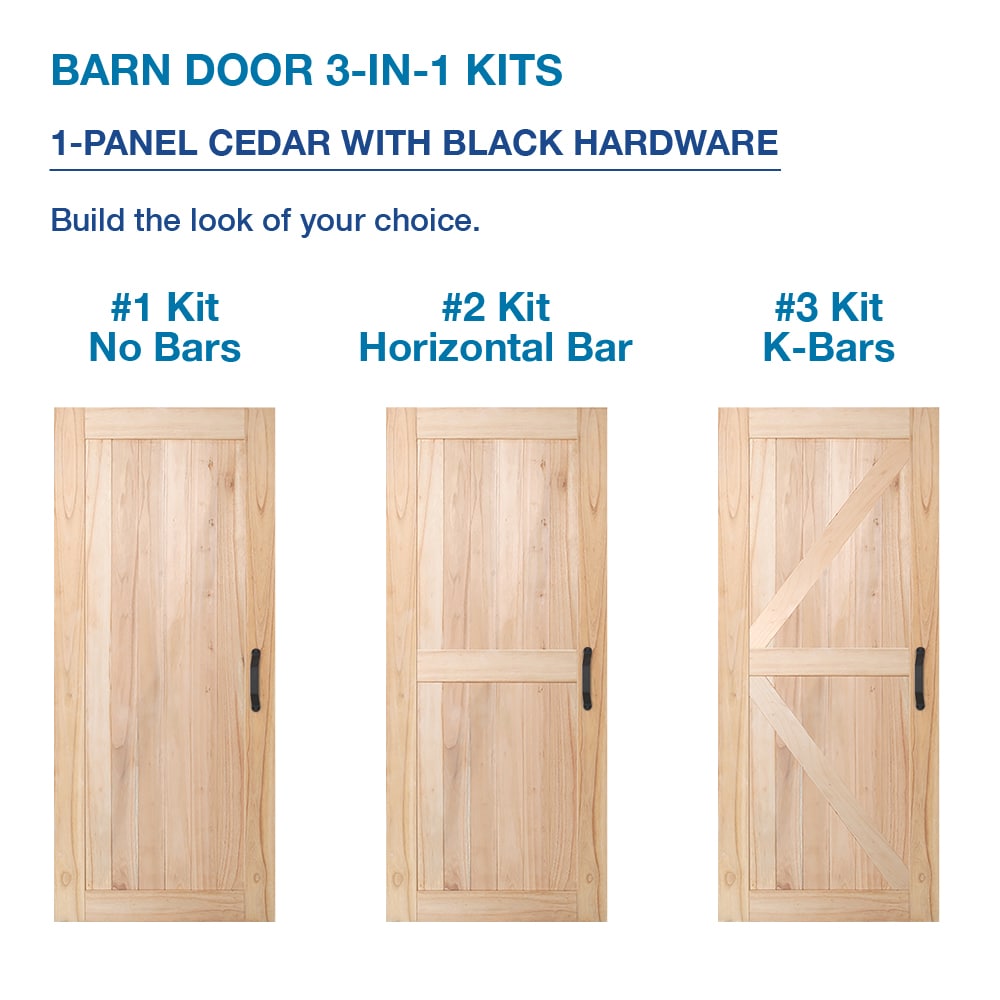This JELD-WEN DesignGlide barn door kit features a solid white cedar wood slab you can finish to match your décor, paired with matte black hardware for a clean, rustic look. The 3-in-1 design lets you install it with no bars, a horizontal bar, or classic K-frame bars, and includes a backer board for straightforward mounting.