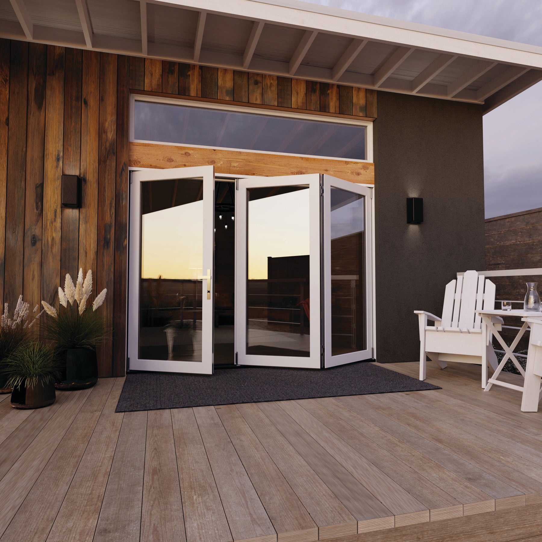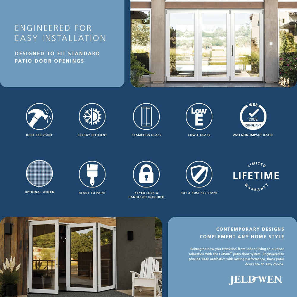 Upgrade indoor-outdoor living with the JELD-WEN F-4500 fiberglass folding patio door. Its frameless direct-glaze Low-E tempered glass panels deliver expansive views and energy efficiency, while a rot-resistant composite jamb and integrated locking system add durability and security.