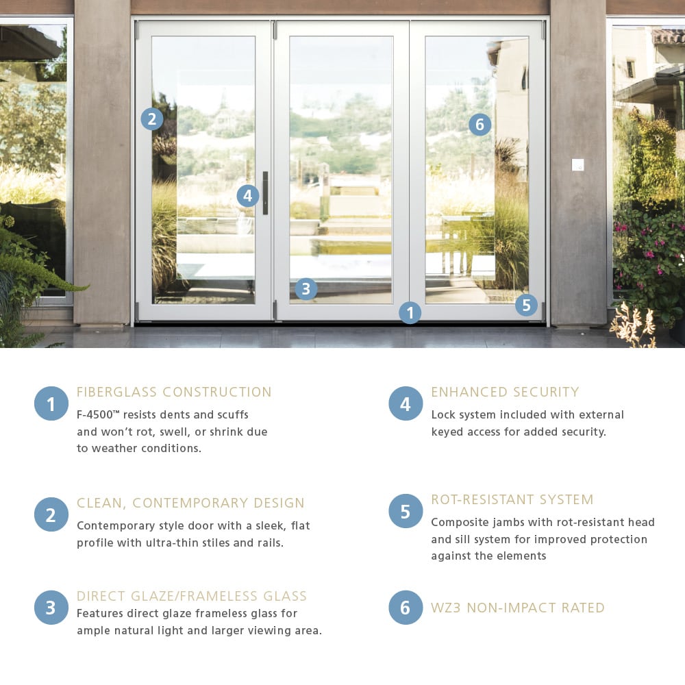 • Frameless Direct-Glaze Glass: 37% more glass than standard patio doors for larger views and natural light
