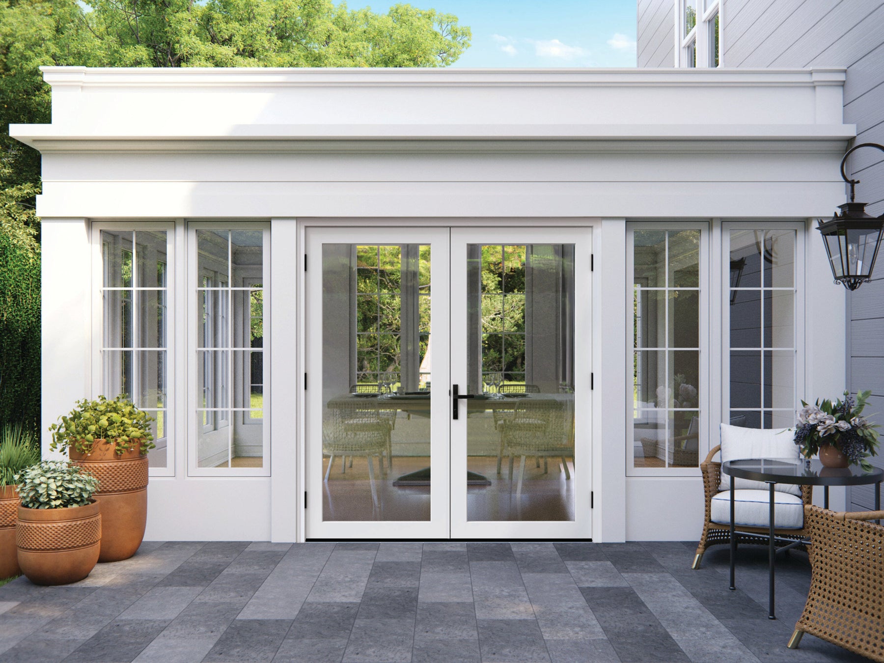 The JELD-WEN F-4500 fiberglass French patio door delivers a sleek, contemporary look with more glass and less frame for expansive views. Built with Low‑E tempered glass, insulating fiberglass panels, and primed inside and out, it’s ENERGY STAR certified and ready for easy retrofit into standard patio openings.