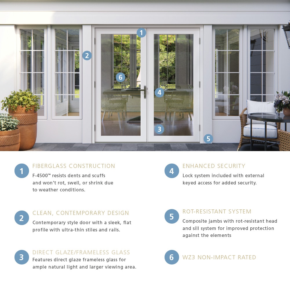 The JELD-WEN F-4500 fiberglass French patio door delivers a sleek, contemporary look with more glass and less frame to flood interiors with natural light. Built with durable, primed fiberglass and Low-E tempered glass, it’s prehung for easy retrofit into standard 72-in x 80-in openings and includes an integrated keyed lock for added security.