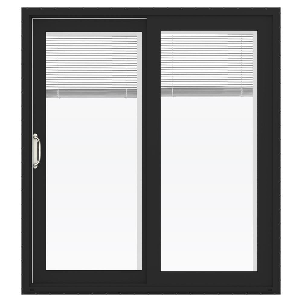 Durable JELD-WEN FiniShield V-4500 vinyl patio door offers a bronze exterior and white interior with integrated blinds sealed between tempered Low‑E glass for easy maintenance and energy efficiency. Heavy-duty stainless steel rollers ensure smooth, reliable left-hand operation, and a screen is included.