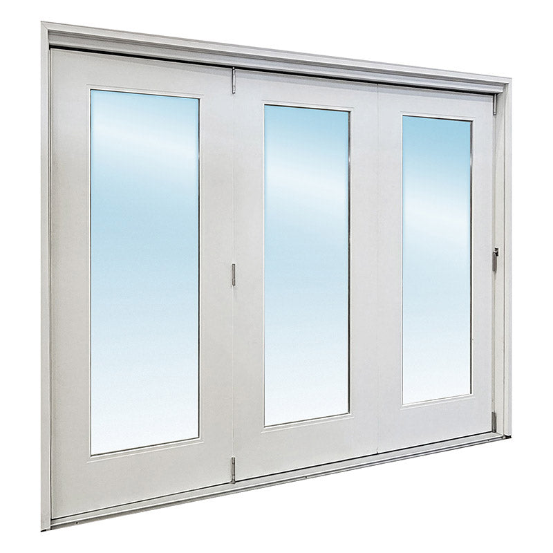 A durable fiberglass folding patio door that opens wide to connect indoor and outdoor spaces. Triple-panel design with insulated Low‑E flush-glazed clear glass and heavy-duty hardware delivers energy efficiency and smooth operation.