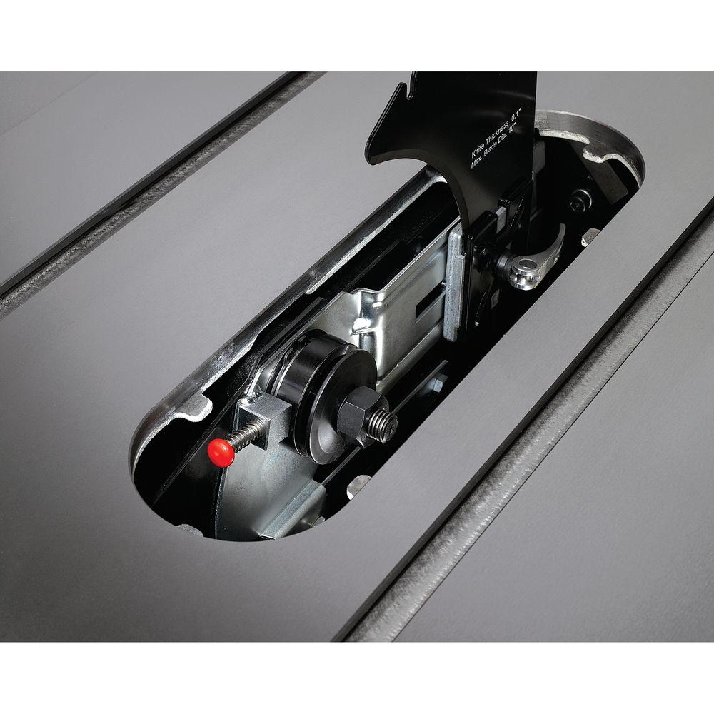 • Deluxe miter gauge with adjustable positive stops and large soft grip handles provides large crosscutting capacity and accurate miters