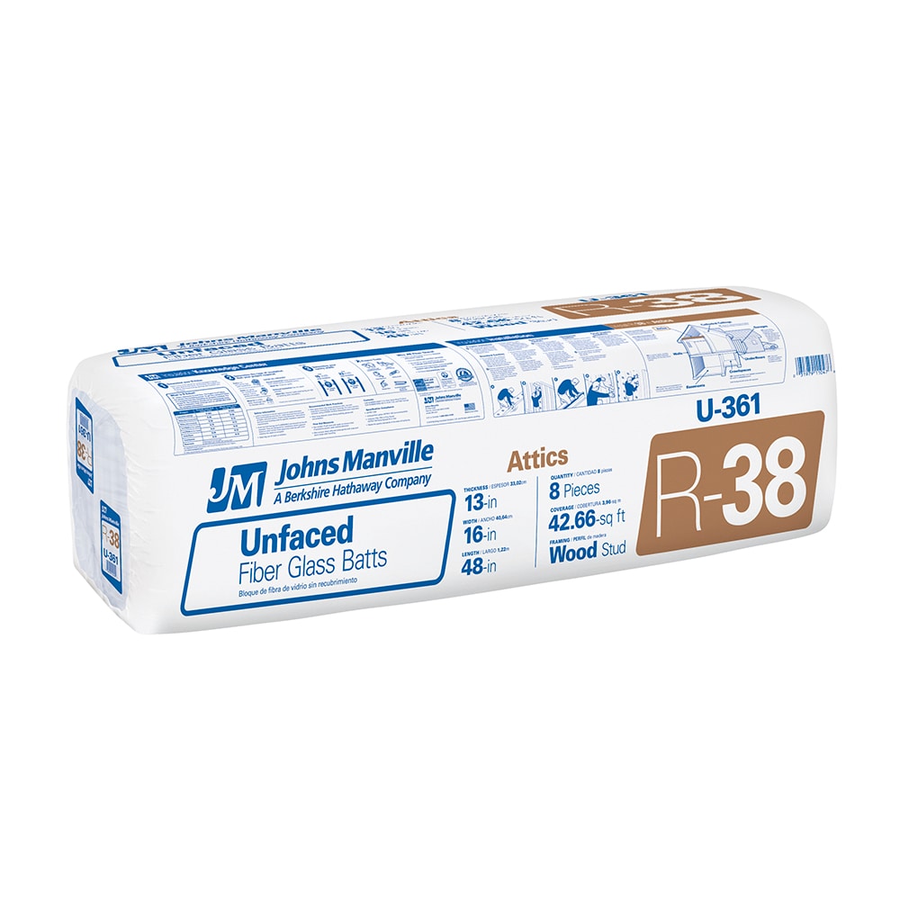 JM (Johns Manville) R-38 unfaced fiberglass batts are pre-cut for 16-in on-center wood framing to help improve thermal performance and add sound control in attics, ceilings, and floors. Unfaced construction has no vapor barrier, making it suitable for adding over existing insulation where permitted.