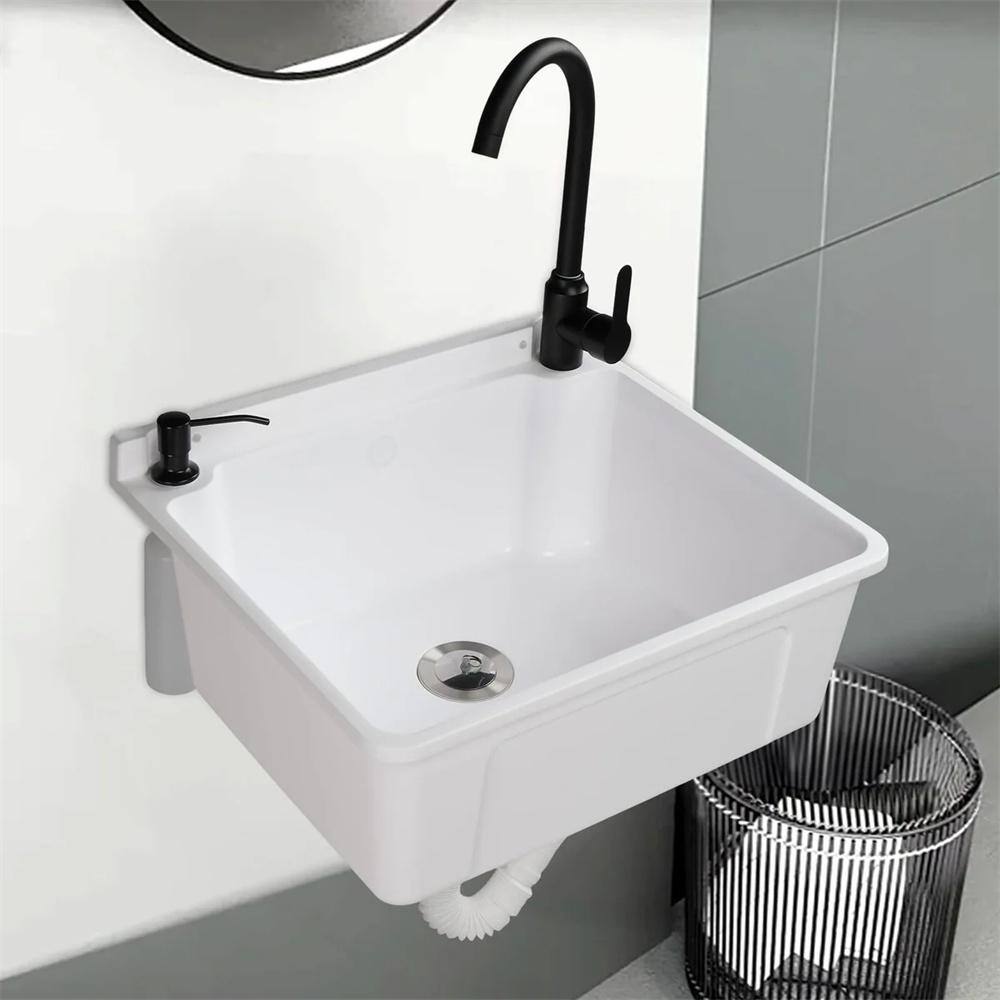 The Karl home Wall Mount Laundry/Utility Sink offers a sleek and space-saving solution, perfect for laundry rooms, workshops, and garages. Crafted from high-quality plastic, it provides durability and easy maintenance. Its convenient wall-mounted design and included faucet make it an all-in-one, efficient choice for any utility area.