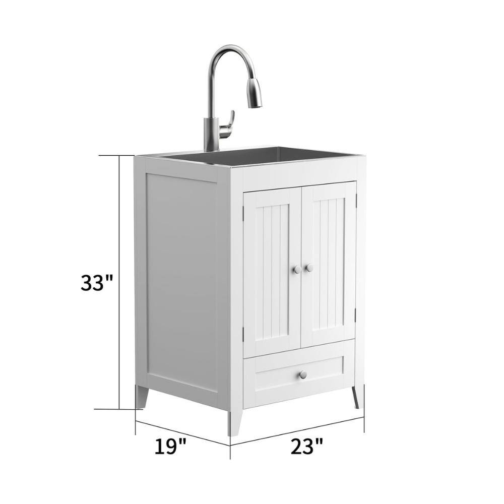 Transform mundane utility spaces into stylish sanctuaries with this sink's sleek design. The high-grade stainless steel catches the light beautifully, while the classic white cabinet offers a crisp, clean contrast. Imagine this unit elegantly tucked within a contemporary laundry room or minimalistic bathroom. Its combination of form and function makes it not just practical but essential for every modern home.