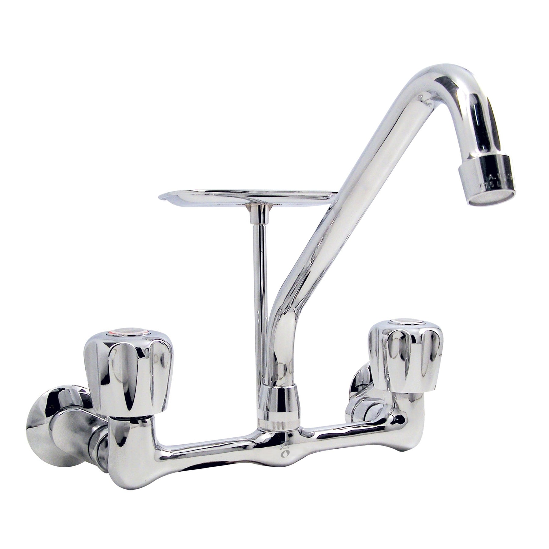 A classic 2-handle wall-mount bridge faucet in polished chrome with durable brass construction. Adjustable centers fit common backsplash installations, and the 8-inch swivel spout with raised soap tray adds practical utility for busy kitchens.